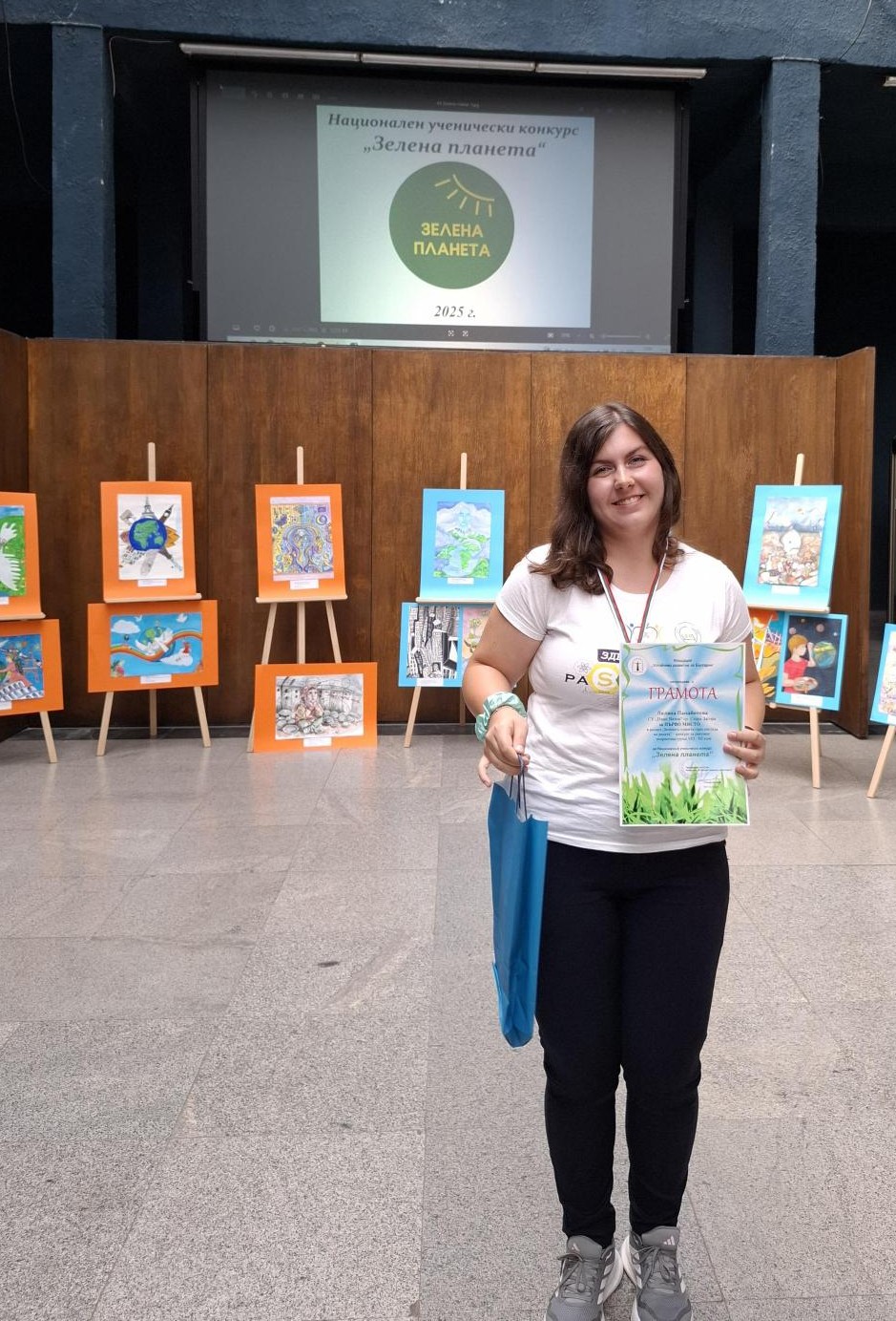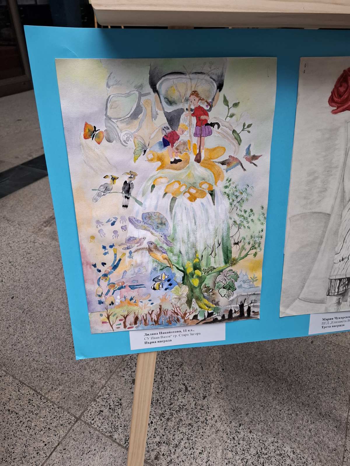 Тържествената церемония за награждаване на победителите се състоя на 25 септември в Националния музей „Земята и хората“. Мотото на конкурса е „Земята – нашият общ дом. Климатичните промени през погледа на децата“ и цели привличане на общественото внимание към международните въпроси на екологията посредством приобщаване на децата и младежите, чрез изкуството и науката, към проблематиката на екологичния поглед към света, който ще подпомогне за хармоничното развитие на личността, сплотяване и формиране у младите на широк поглед върху обкръжаващия ги свят и грижата за него. Учениците от СУ „Иван Вазов“ от прогимназиален и гимназиален етап се включиха в конкурса с творческата, художествена, социалнополезна и изследователска дейност, резултат на многогодишна екологична дейност на колектива. Ментори на учениците са преподавателите по природни науки старши учители г-жа Анета Йорданова и г-жа Нина Йорданова. Радваме се да споделим, че Лиляна Панайотова от 12.б клас, STEM паралелка „Икономическа информатика“ е класирана на първо място в категория „Зелената планета през погледа на децата”. Лиляна е част от СТЕМ екипа като модератор от неговото създаване от 2022 година и печели поредната първа награда със своите оригинални творчески и научни идеи.