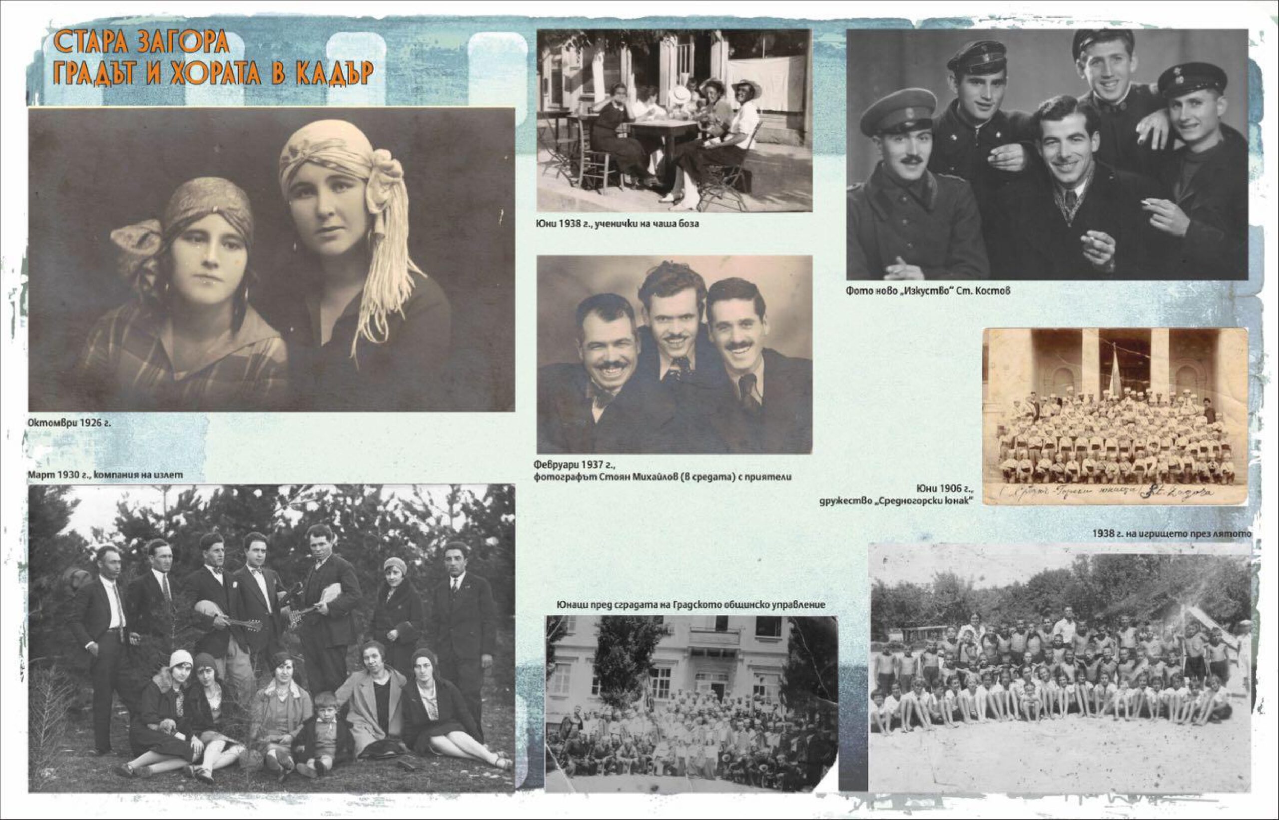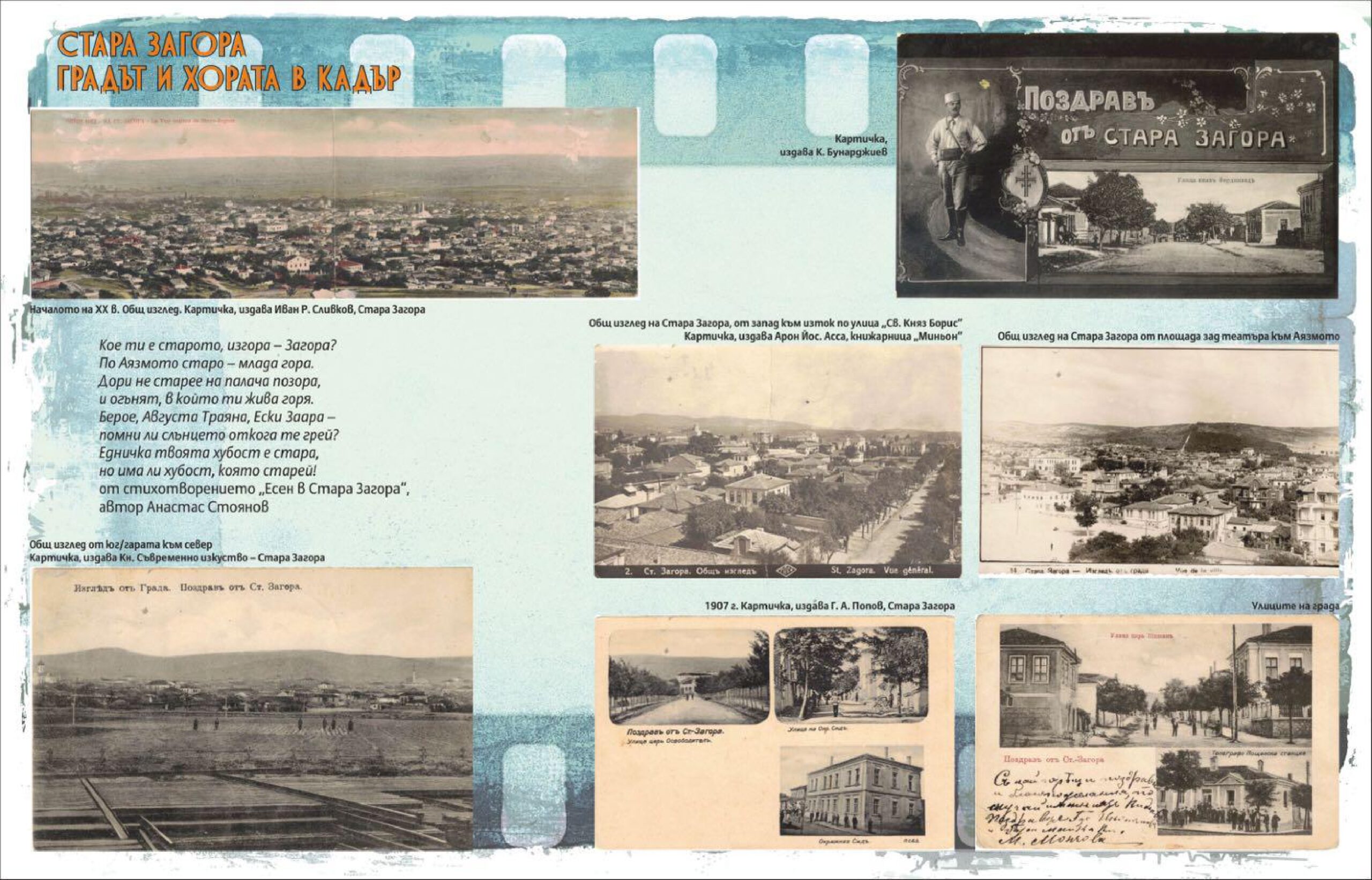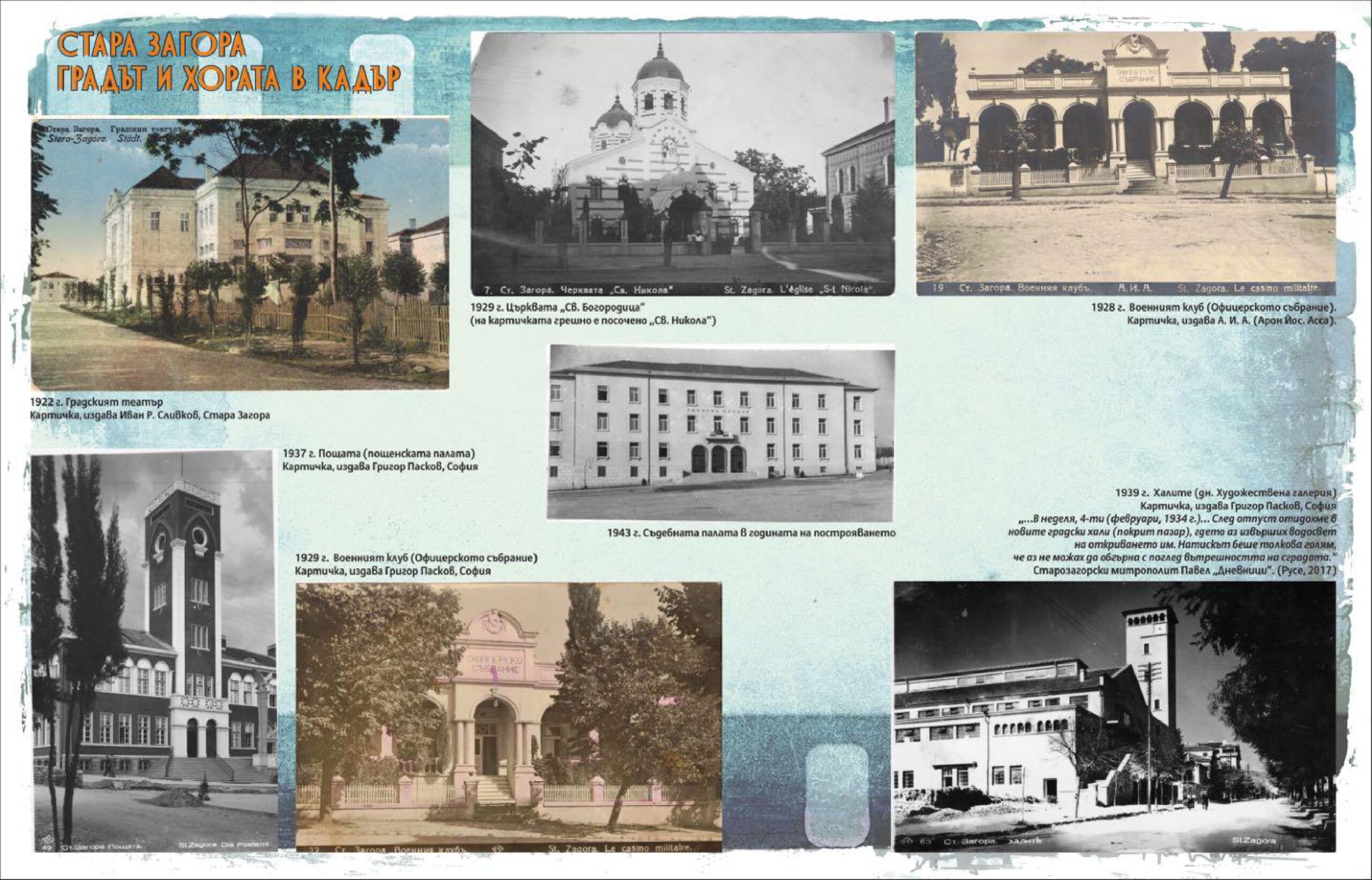Общи изгледи от Стара Загора. Градът ни е опожарен през Освободителната война 1877/78 г. Затова и не са останали много свидетелства от Възрожденския период. В края на 19. и началото на 20. век вече работят фотографи, книжари и издатели, които представят възстановяващия се град. Показани са картички на Иван Р. Сливков, Григор Пасков, Г. А. Попов, К. Бунарджиев, книжарница „Съвременно изкуство“ – Стара Загора, на тайнствения издател и А. И. А. (за когото си струва да се разкаже отделно). Открояват се правите улици, новопостроените сгради и цялостната панорама на града. Интересни са отпечатъците от две стъклени фотографски плаки, датирани от 30-те години на 20. век. Снимани са част от Градската градина, централната Ески джамия в града, дюкяните около нея и няколко по-високи сгради, които отдавна вече ги няма.
