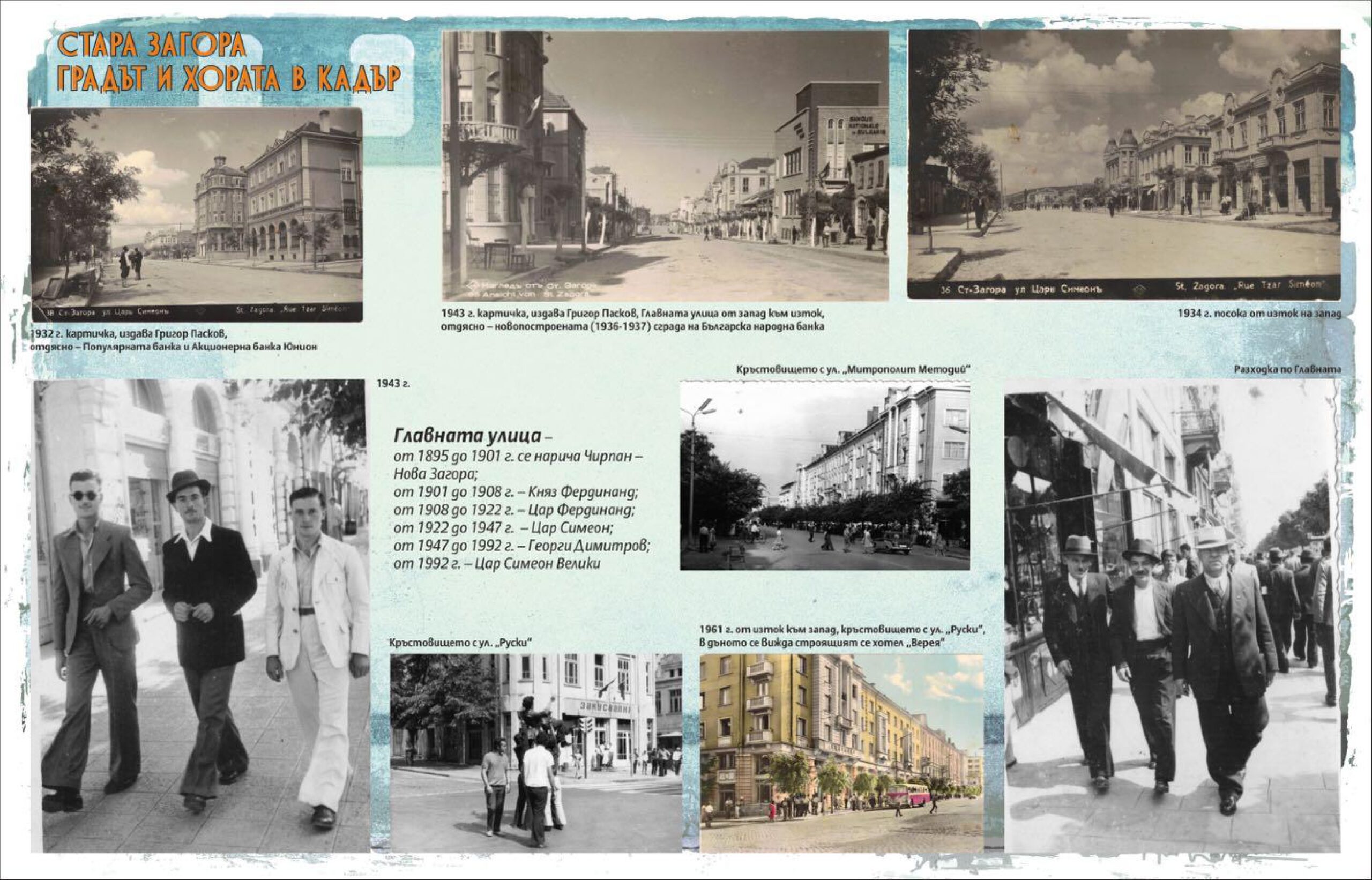 Главната улица „Цар Симеон Велики“ или както са я наричали при възстановяването на града „Чирпан – Нова Загора“. Широка, просторна, с размери, определени още в плана на Либор Байер, с красиви сгради. През 1927 г. Общинският съвет в Стара Загора приема изменение в благоустройствения правилник на града, според което по улиците „Цар Симеон“, „Митрополит Методий“, „Цар Освободител“, „Димитър Наумов“ и „Цар Борис“ няма да се разрешава строежа на едноетажни сгради, нито поддържането им. На таблото са отбелязани различните имена на улицата, съобразени с политическата конюнктура. Снимките показват само малка част от очарованието на улицата. От началото на 20. век част от нея е била тройна, по средата с дървета и широка алея за разходки. Старозагорци и гостите на града обичали да си правят снимки на Главната улица.