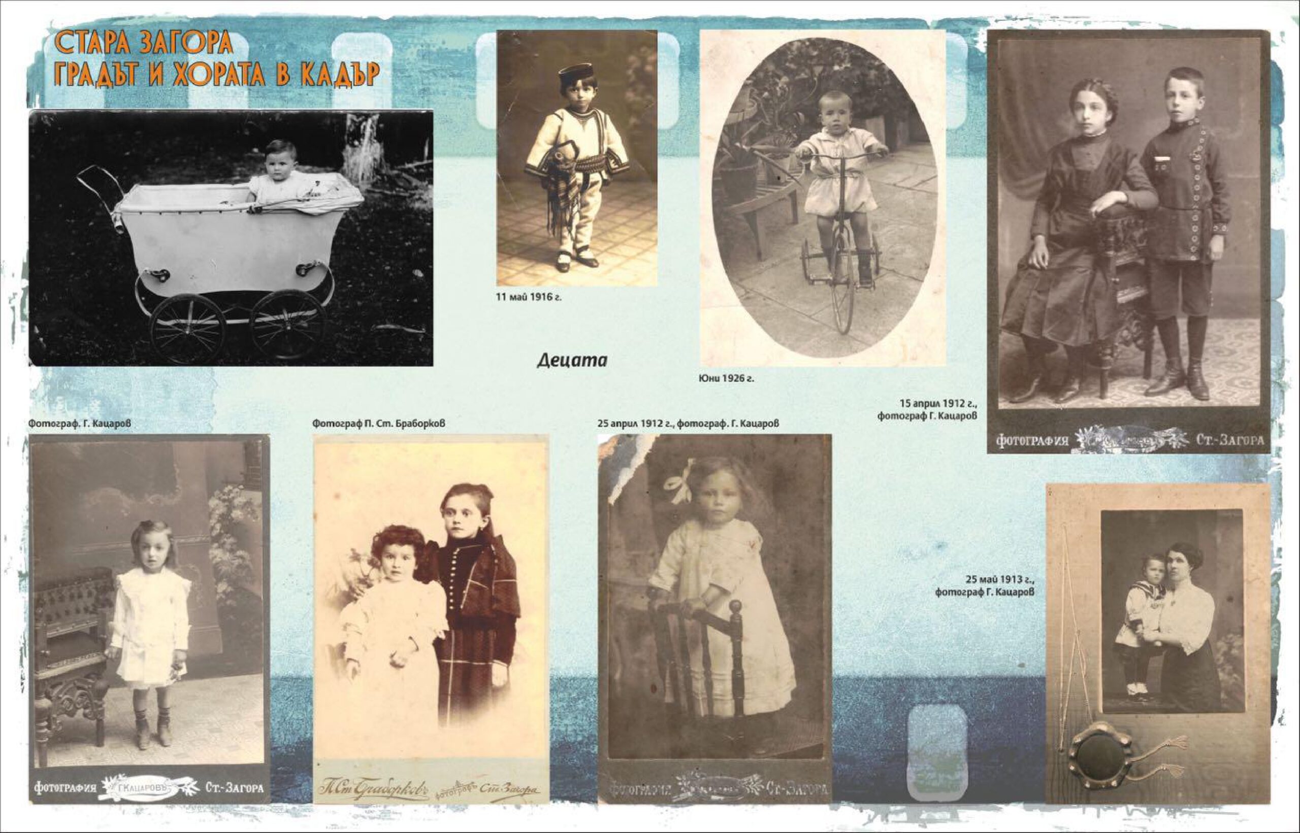 Децата грижа и гордост във всяко старозагорско семейство. В ония години, пък и сега, всякой би искал да се похвали с новото попълнение на семейството. Облечени с най-новите дрешки, измити, сресани, с мама и тати или самостоятелно, още в количка или вече поотраснали, малките наследници са изправени пред фотокамерата. Е, тя малко ги плаши, но въпреки това портретите им предизвикват умиление. И са разпращани с радост на близки и приятели.
