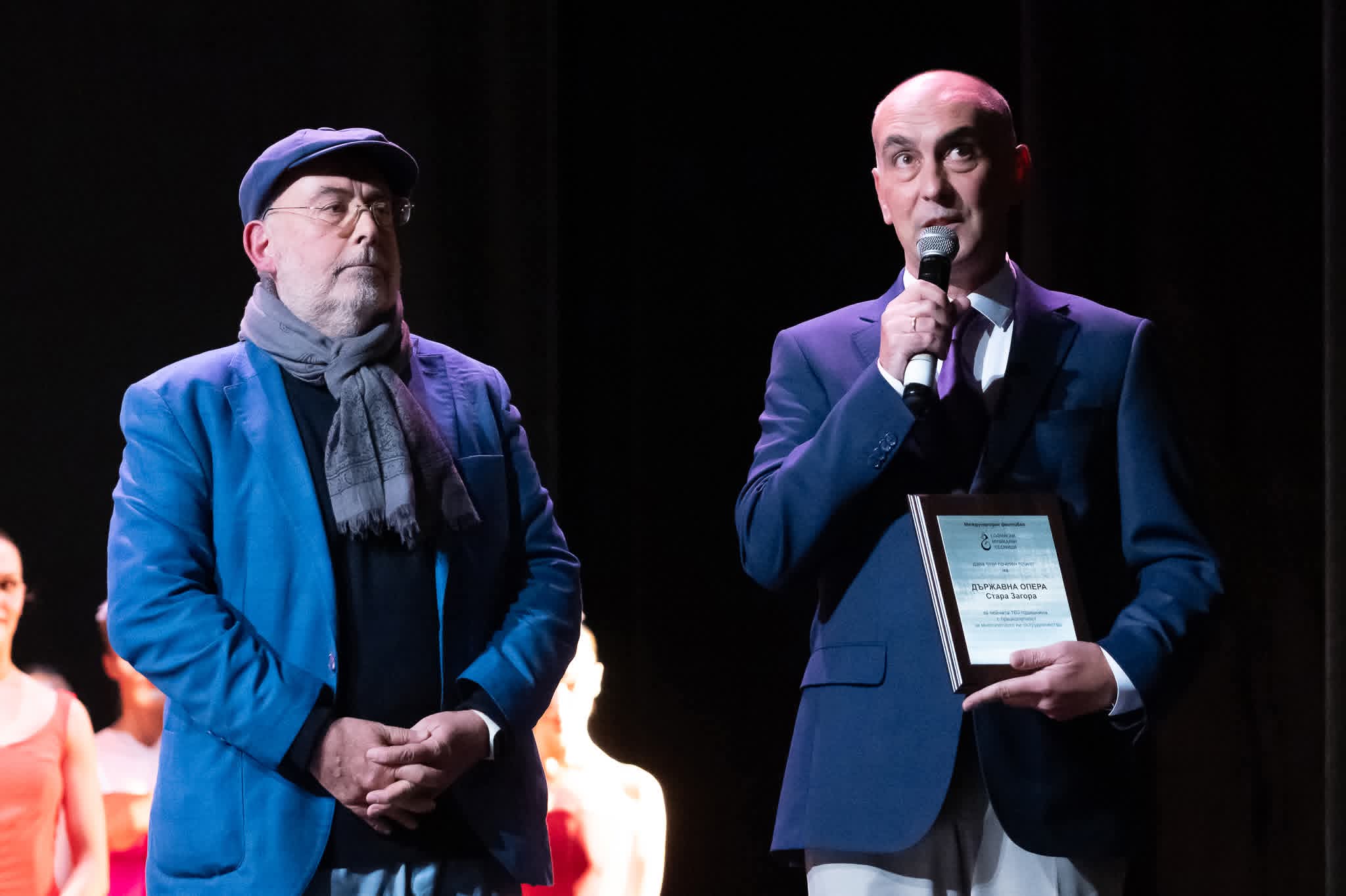 След зашеметяващия спектакъл „Парижки нощи“ специален почетен плакет за Държавна опера – Стара Загора по повод 100 годишнината на първата извънстолична опера връчи на сцената директорът на МФ „Софийски музикални седмици“ проф. Момчил Георгиев на директора на Старозагорската опера Владимир Бошнаков с благодарност за „многолетното“ сътрудничество!