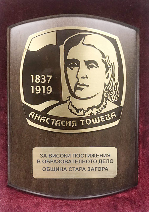 Наградата „Анастасия Тошева“ е ежегодна и се връчва „за високи постижения в образователното дело“. Отличието представлява плакет, който се присъжда като признание и поощрение на педагогически колективи, директори на училища и детски градини, учители и ученици, за популяризиране на техния професионализъм, талант и граждански принос за развитието на образованието в Община Стара Загора . С наградата се отличават дейци на науката и образованието, чиито постижения представляват принос за развитието на Стара Загора; Ученици и студенти, спечелили призови места в международни и национални конкурси и олимпиади.
