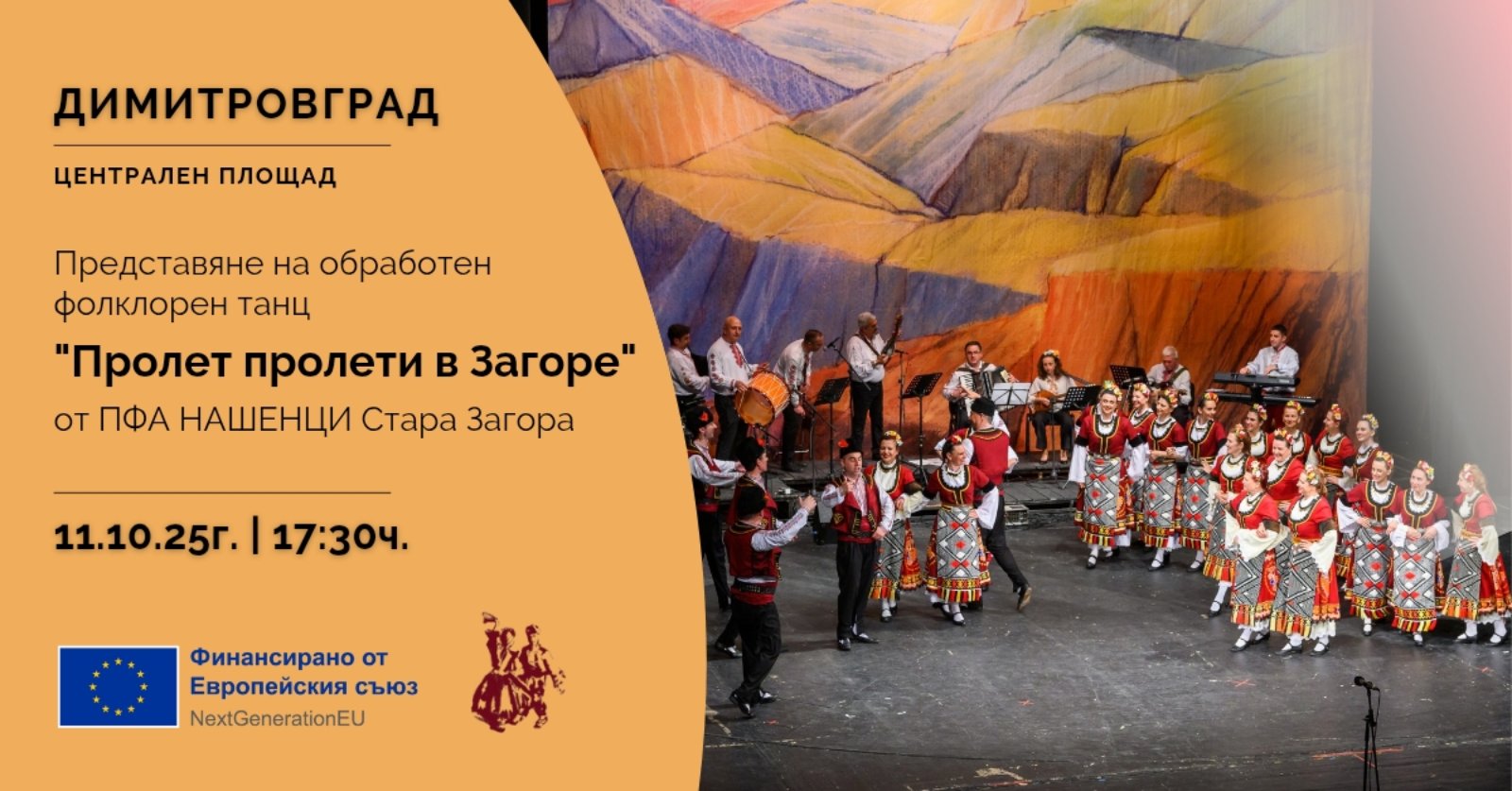 На 11 октомври 2025 г. (събота) от 17:30 ч. на централния площад в Димитровград, Фолклорен ансамбъл „Нашенци“ ще представи обработен фолклорен танц „Пролет пролети в Загоре“. Събитието е част от концерт-спектакъла „Есен на мегдана нашенски 2025“, организиран от НЧ „Васил Левски 2003“ – Димитровград, и обещава да превърне есенната вечер в истински празник на българския дух и традиция.