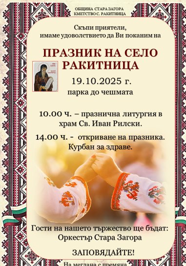 Старозагорското село Ракитница очаква своите гости с празнична програма на 19 октомври 2025 г.