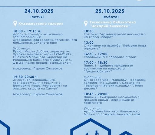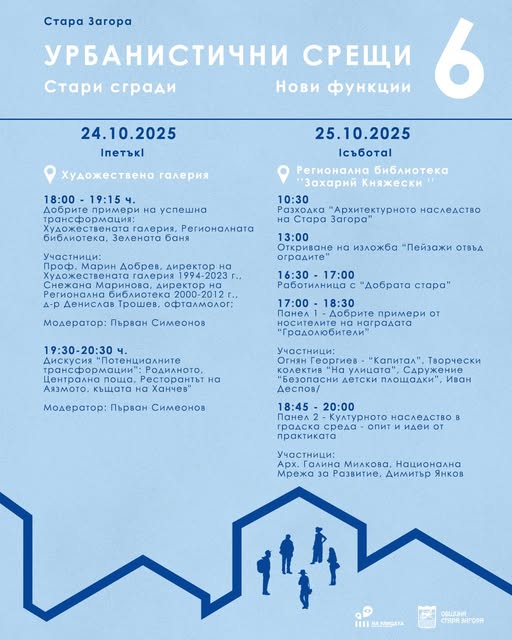 Творческият колектив „На улицата“ ви кани на 24 и 25 октомври 2025г. на специализирания дискусионен формат „Урбанистични срещи“, който се превърна в традиция в последните шест години. Той е вдъхновен от факта, че именно Стара Загора е родното място на българското градоустройство – с емблематичния план за възстановяване на града от 1879 г. на Лубор Байер след пожарите на Освободителната война.