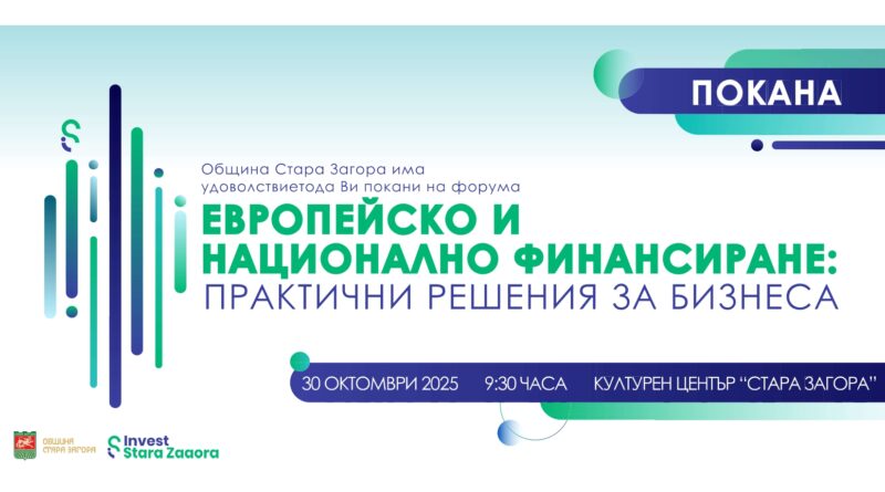 Форумът „Европейско и национално финансиране: практични решения за бизнеса“ ще се проведе на 30 октомври 2025 г., четвъртък, в Културен център „Стара Загора“. Негов организатор е Invest Stara Zagora – отделът за инвестиции, енергийна ефективност и зелен преход към Община Стара Загора. Събитието е насочено към практическото прилагане на европейските и националните програми за подкрепа на бизнеса – с актуални инструменти, работещи примери и насоки за подготовка на успешни проекти, обобщи авансово началникът на отдела Росица Райкова.