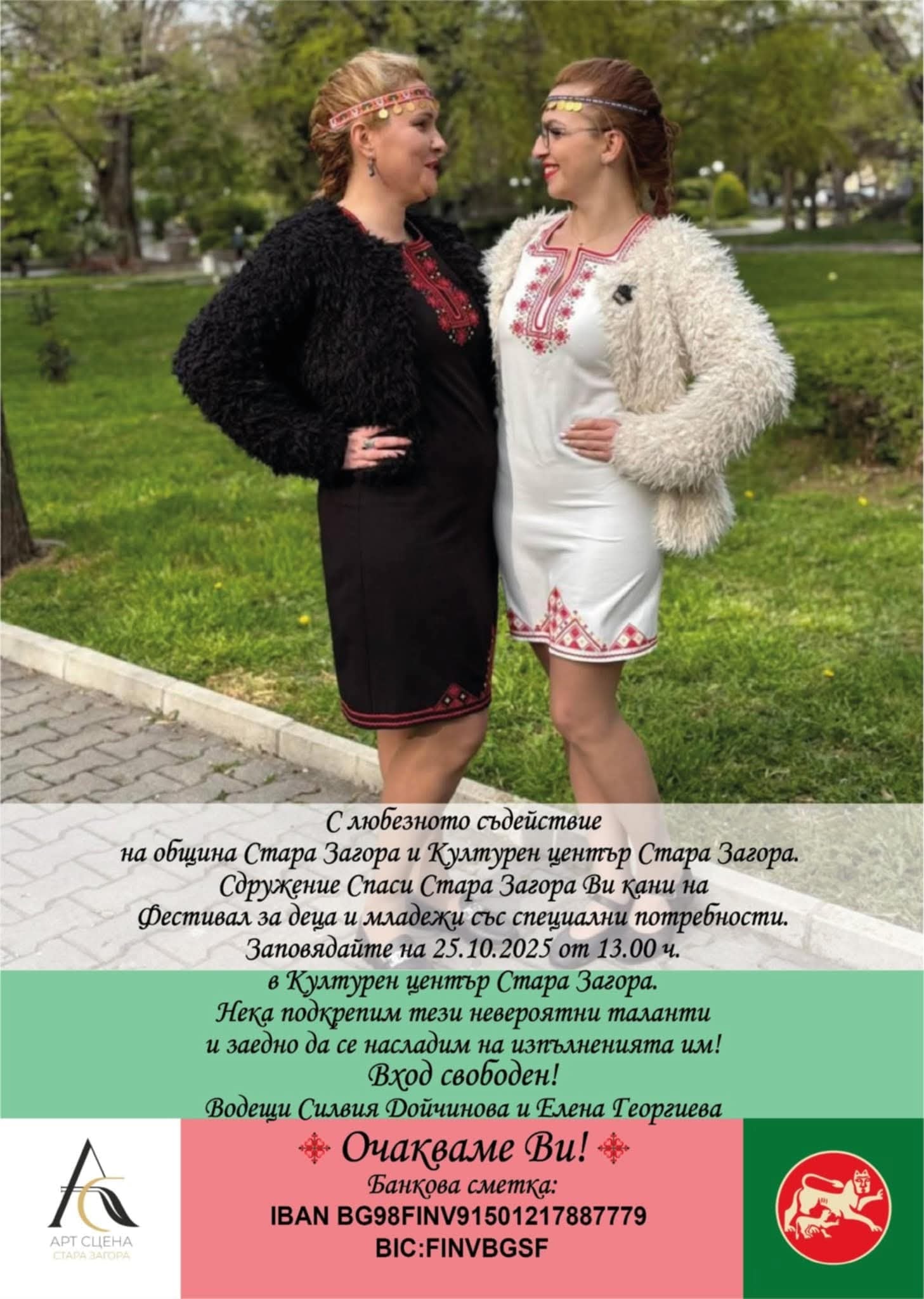 За първи път в Стара Загора ще се проведе Фестивал за деца и младежи със специални потребности. Организатори са сдружение „Спаси Стара Загора“ с подкрепата на Община Стара Загора, а водещи ще бъдат Силвия Дойчинова и Елена Георгиева.