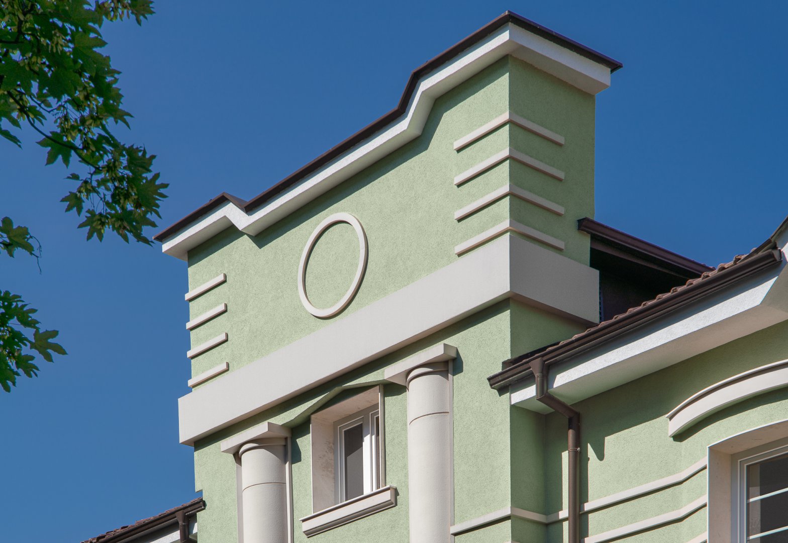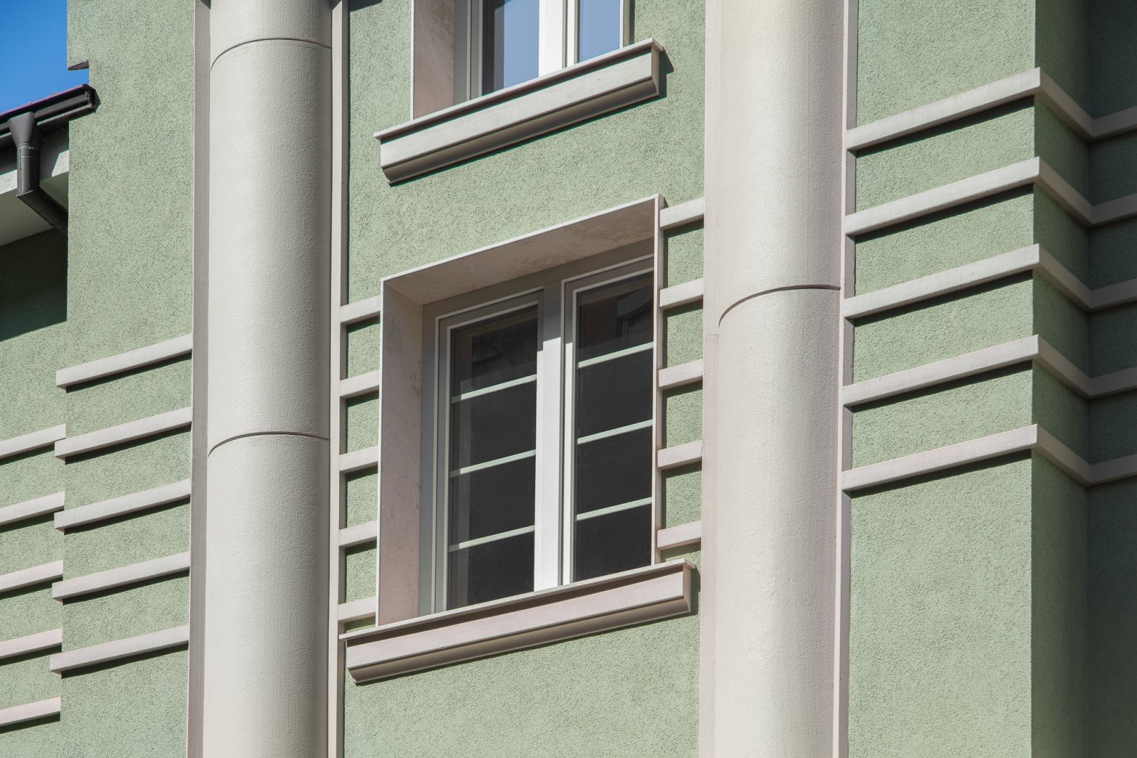 Системата е Баумит интегрирана топлоизолационна система Стар с крайни покрития КристалТоп и НанопорТоп К1,5; боя ГранопорКолор – цветове 1024 и 1028.