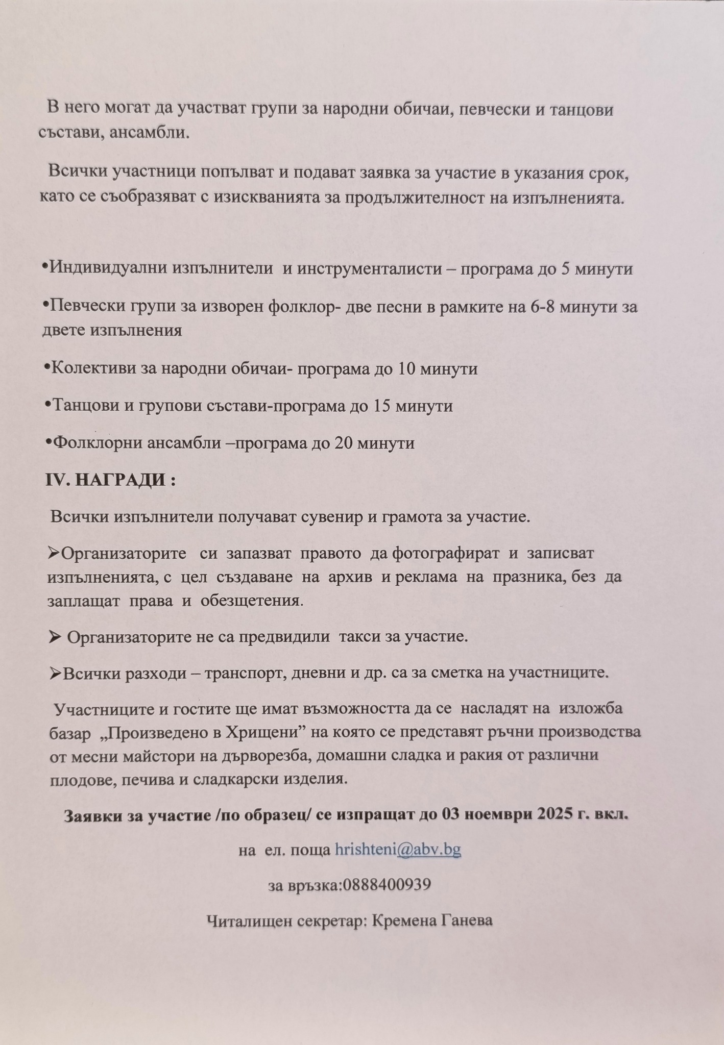 Във фолклорната програма могат да участват групи за народни обичаи, певчески и танцови състави, ансамбли и индивидуални изпълнители. Заявки за участие се приемат до 3-ти ноември 2025 г.