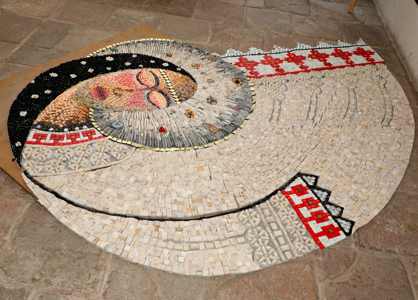 Мозайката „Неродена мома“, открита днес, е изработена от естествени материали: травертин, естествен камък, смалти и злато. В нея са съчетани много техника и материали със зрелищен финален ефект.