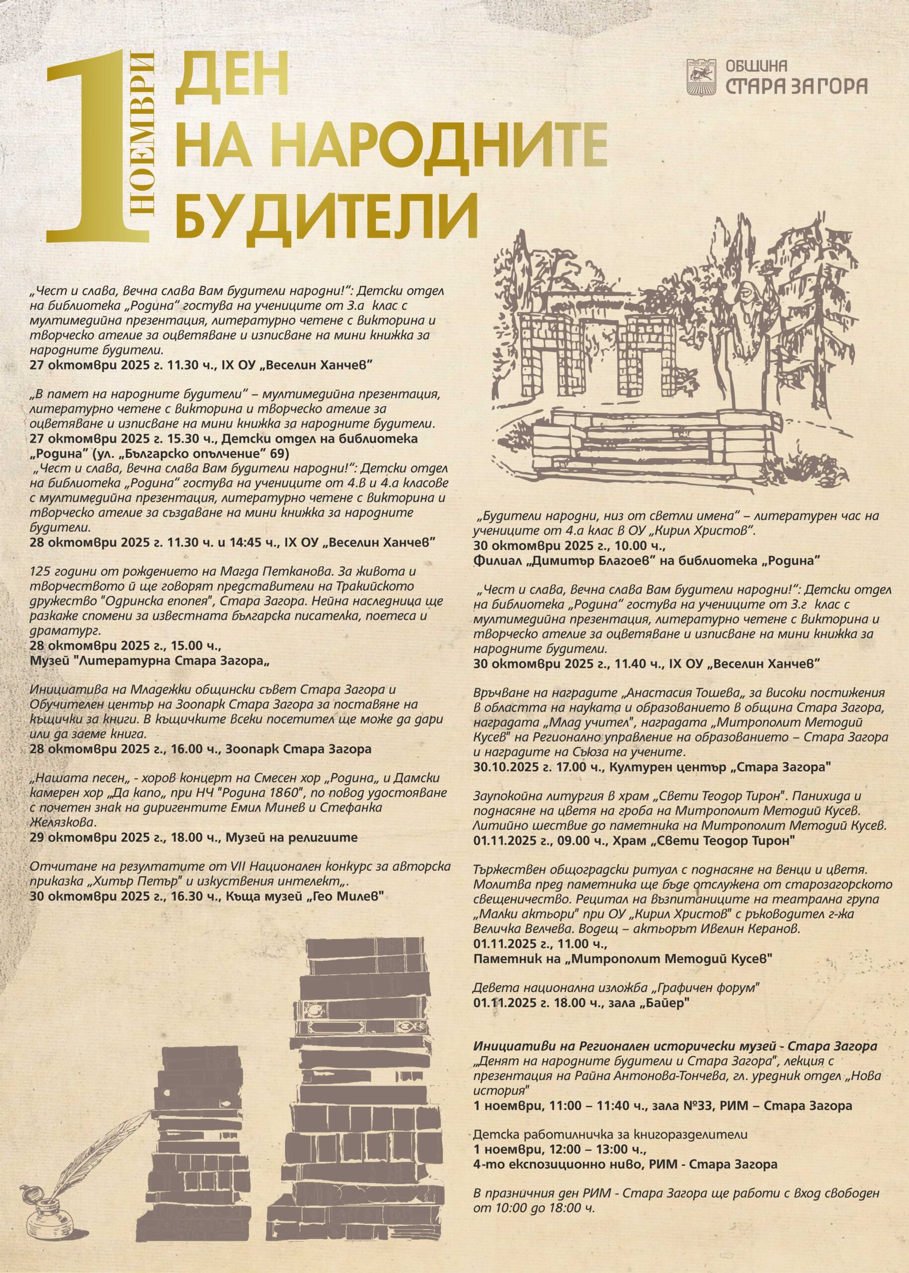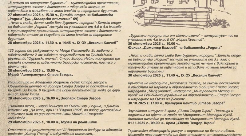 Събитията, посветени на Деня на народните будители започват от 27 октомври 2025 г., а на 30 октомври 2025 г. ще бъдат връчени наградите „Анастасия Тошева“ от 17.00 ч. в Културен Център „Стара Загора“. В празничната програма са предвидени събития за всички възрасти.