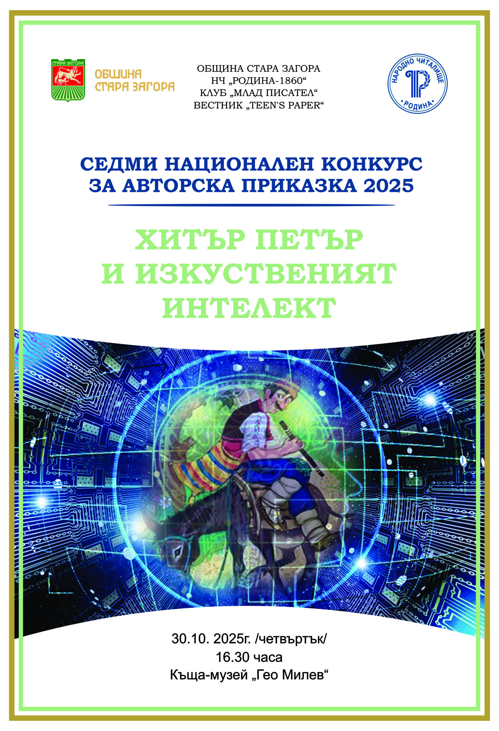 Седмият Национален конкурс за авторска приказка`2025  „Хитър Петър и изкуственият интелект“ вече е история. Организира се всяка година  от Община Стара Загора и Народно читалище „Родина-1860“.