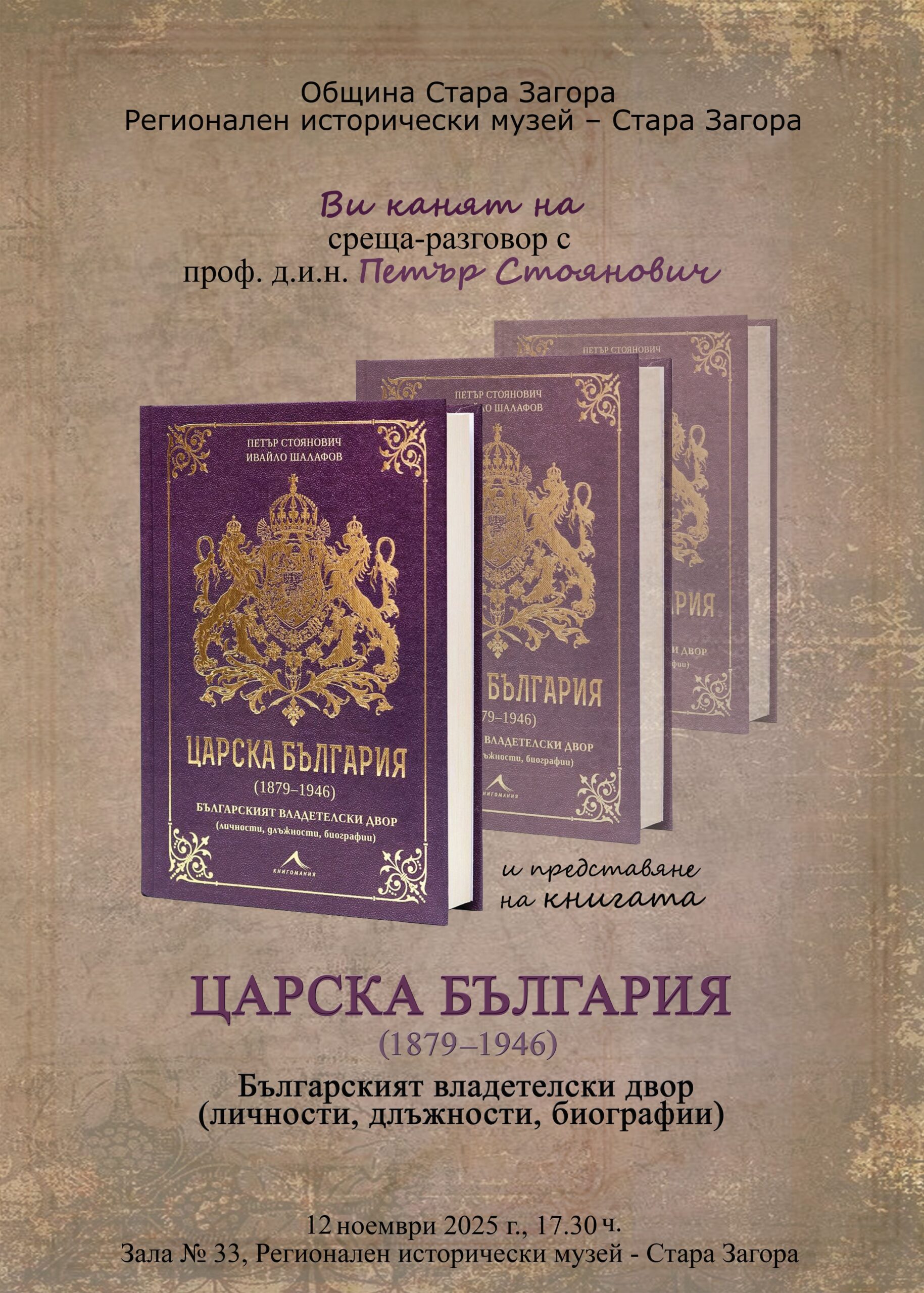 На 12 ноември 2025г. от 17:30 ч. в зала №33 на Регионалнен исторически музей – Стара Загора ще се състои среща-разговор с проф. д.и.н. Петър Стоянович и представяне на книгата „Царска България (1879–1946). Българският владетелски двор (личности, длъжности, биографии)“, написана в съавторство с доц. д-р Ивайло Шалафов.