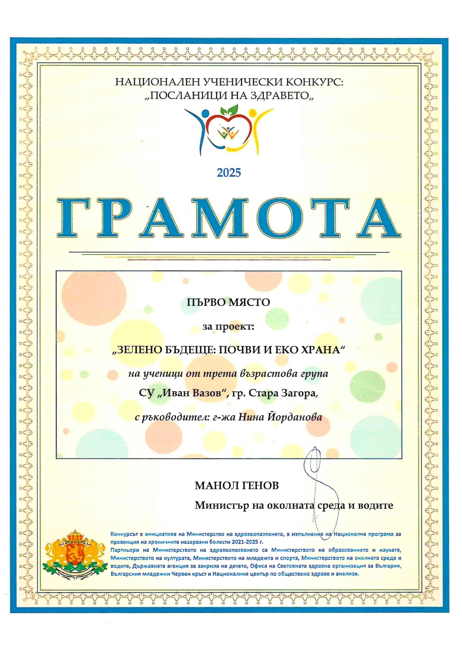 Проектът на СУ „Иван Вазов“ Зелено бъдеще: еко храна“ е класиран на първо място от МОСВ в Националния ученически конкурс „Посланици на здравето 2025 г.“