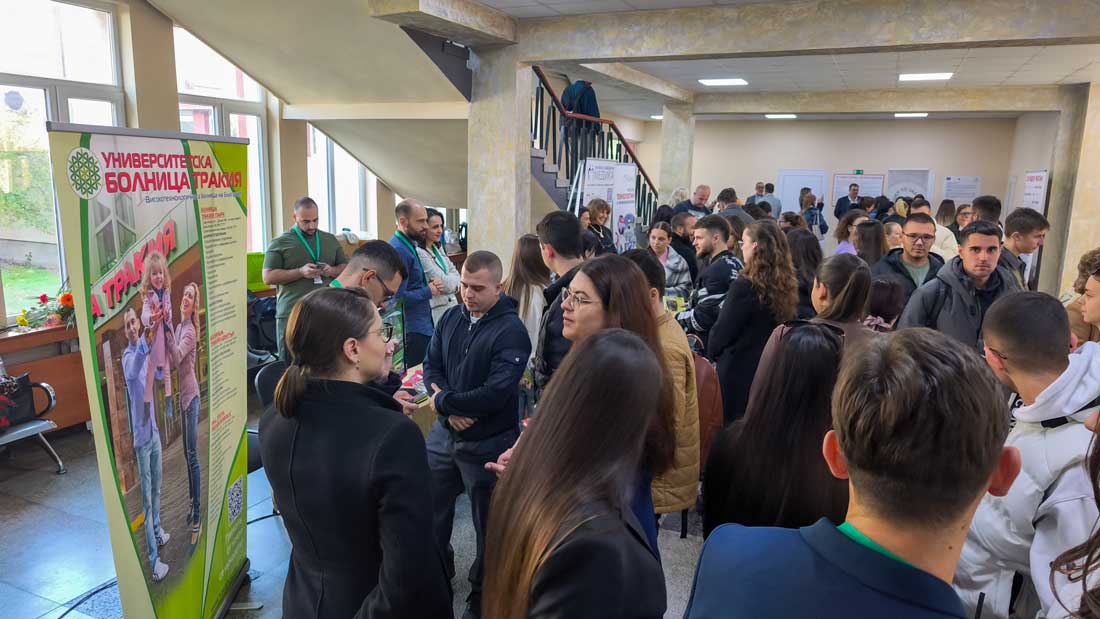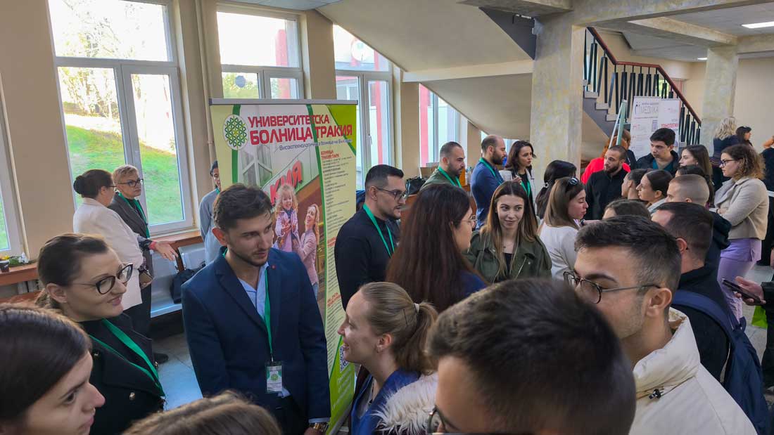 „Това е ден, в който вие, студентите, имате възможност да изградите контакти с много работодатели от здравния сектор. Това е възможност да представите себе си уверено пред общността и да получите актуална информация за стажове, за практики и за професионална реализация в отделните заведения“, каза при откриването доц. Георги Калайджиев, ръководител на Центъра за кариерно развитие към Тракийския университет.