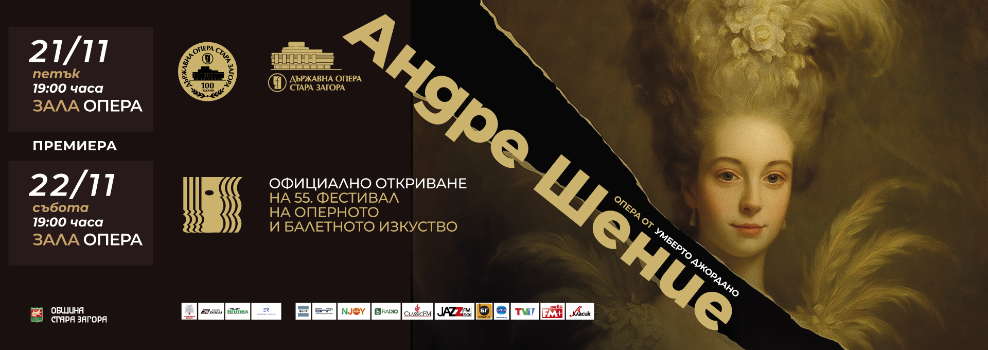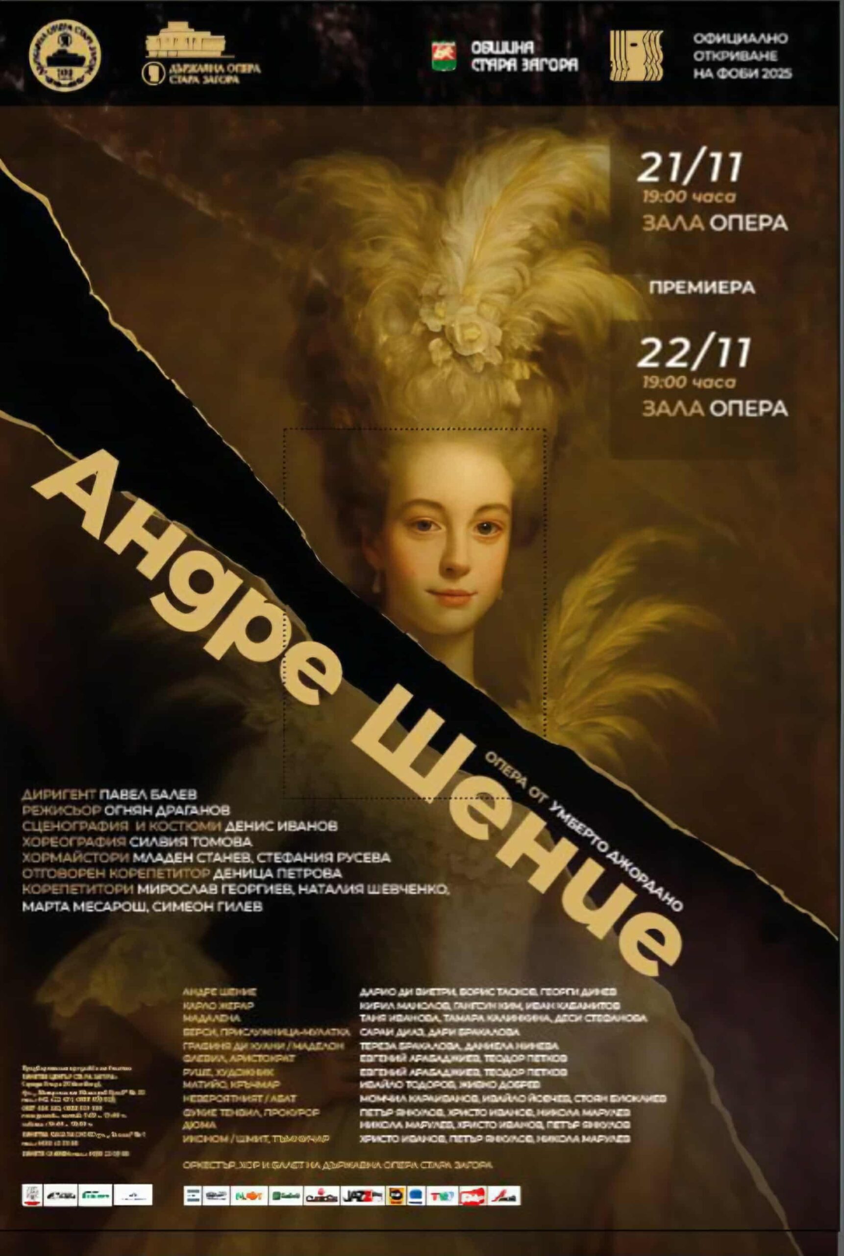 На 21 и 22 ноември, с премиера на операта „Андре Шение“, старозагорската оперна трупа за първи път в едновековната си история ще се срещне с творбата на Умберто Джордано. Сюжетното действие отвежда към драматичните събития във Франция по време на революционните обществени промени от края на 18 -ти век. Режисьор е Огнян Драганов. Основната задача, която си поставя диригентът Павел Балев е как да се предаде повече топлина на “звука” на революцията.