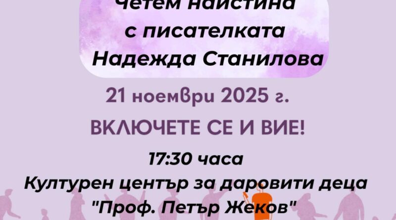 Литературният клуб към Центъра за подкрепа за личностно развитие – Стара Загора организира тематичната среща „Четем наистина с писателката Надежда Станилова“. Срещата ще се проведе на 21 ноември 2025 г. от 17.30 ч. в камерната зала на Културния център за даровити деца „Проф. Петър Жеков“, ул. „Митрополит Методий Кусев“ №20, с вход свободен.