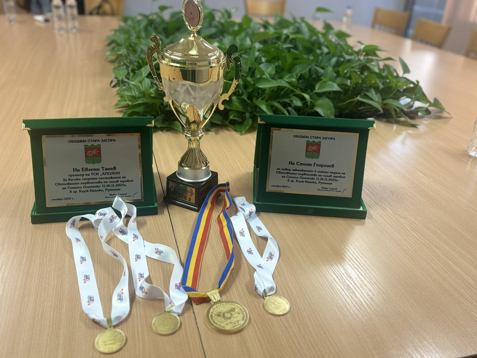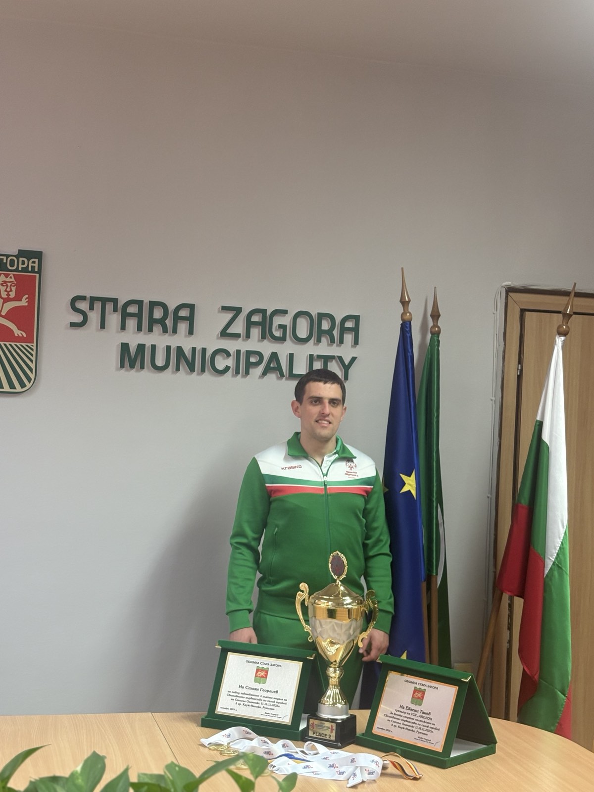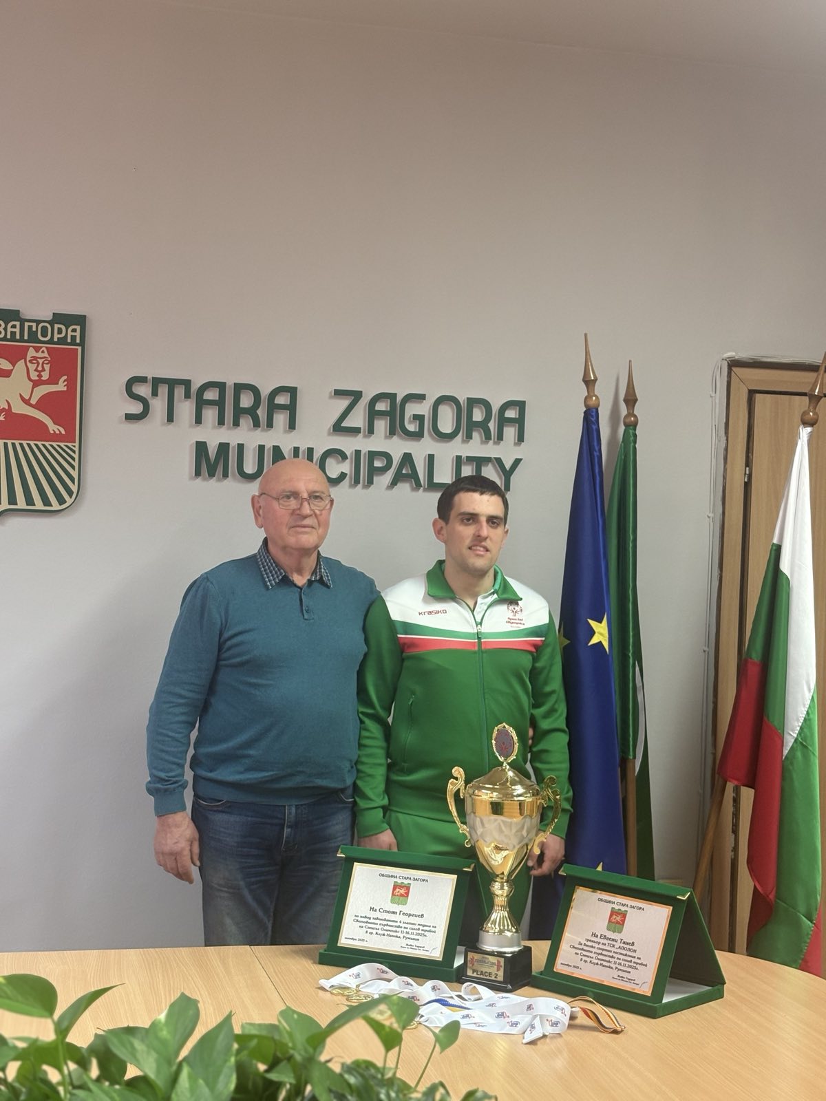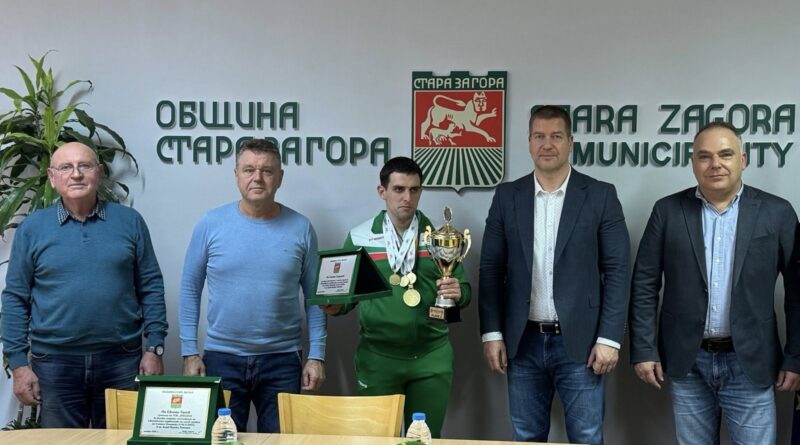 Кметът Живко Тодоров удостои с плакети световния шампион по силов трибой Стоян Георгиев и неговия треньор Евгени Танев. Отличието бе връчено по повод четирите златни медала, които младият спортист завоюва на Световното първенство в румънския град Клуж-Напока. В зала 203 на Община Стара Загора присъстваха треньори, спортни специалисти и представители на местните медии. Сред гостите бяха началникът на отдел „Спортни дейности“ Петко Крумов, треньорите Евгени Танев и Стоян Стоянов (дядо на състезателя).