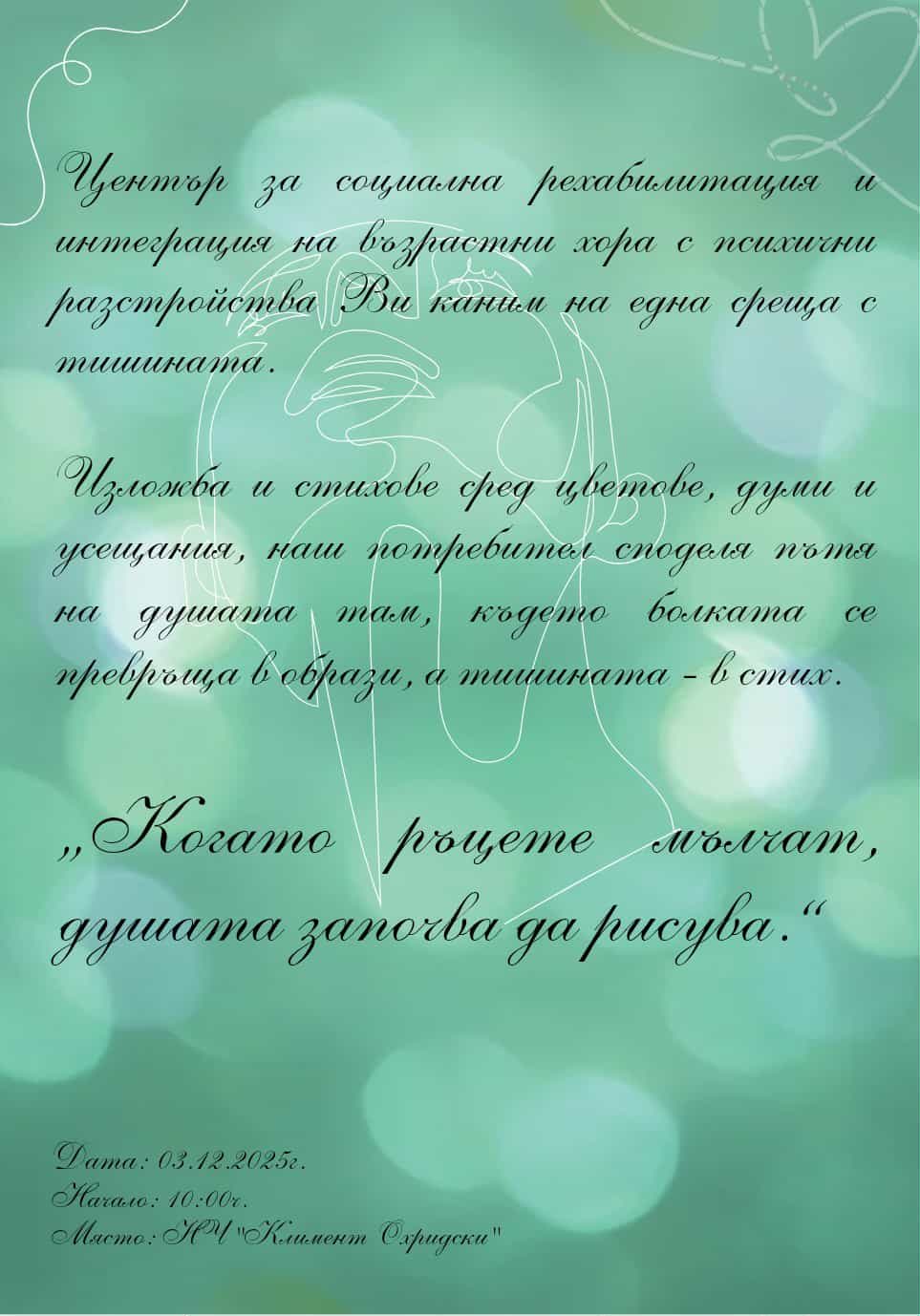 На 3 декември в 10 часа в НЧ“Свети Климент Охридски“ ще бъде открита изложба и представена стихосбирка на един самороден талант – Нейчо Георгиев, който от години посещава Центъра за социална рехабилитация и интеграция за възрастни хора с психични разстройства.