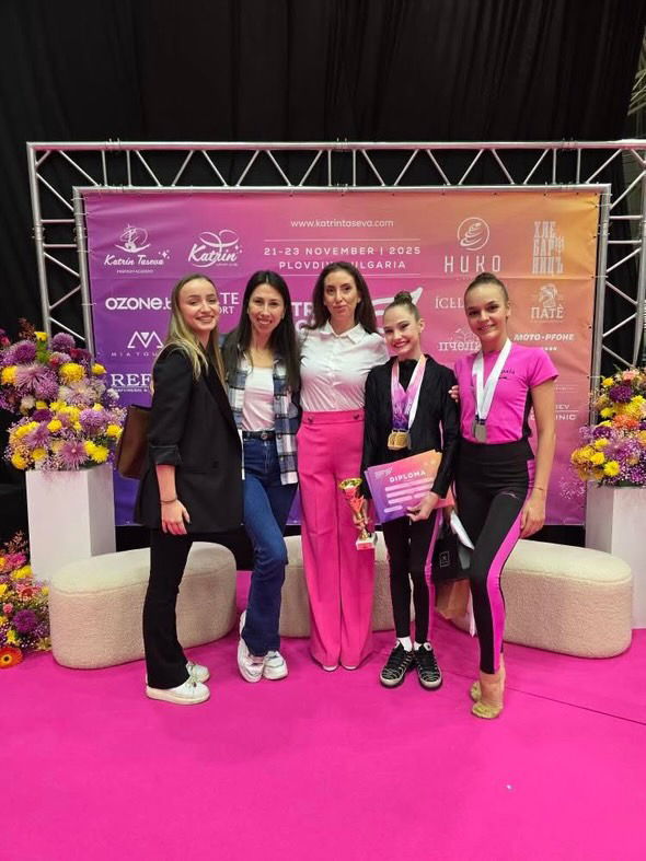 Заслуга за отличната подготовка на Ивон имат треньорите от СКХГ „Импала“ – невероятни хора и професионалисти: Венера Петкова, Фиген Мехмед, Мартина Грозева и Камелия Ослиева, с президент Петя Петкова.