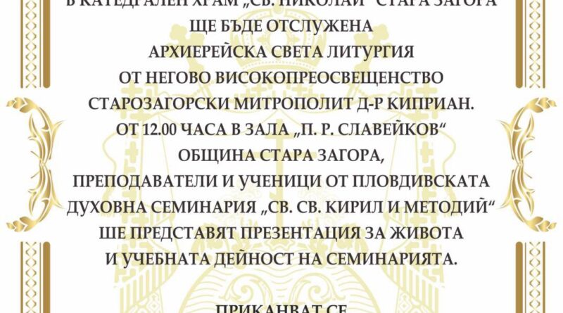 Негово Високопреосвещенство Старозагорският митрополит д-р Киприан и Пловдивската духовна семинария „Св. св. Кирил и Методий“ в партньорство с Община Стара Загора организират „Ден на отворените врати“ на Пловдивската духовната семинария