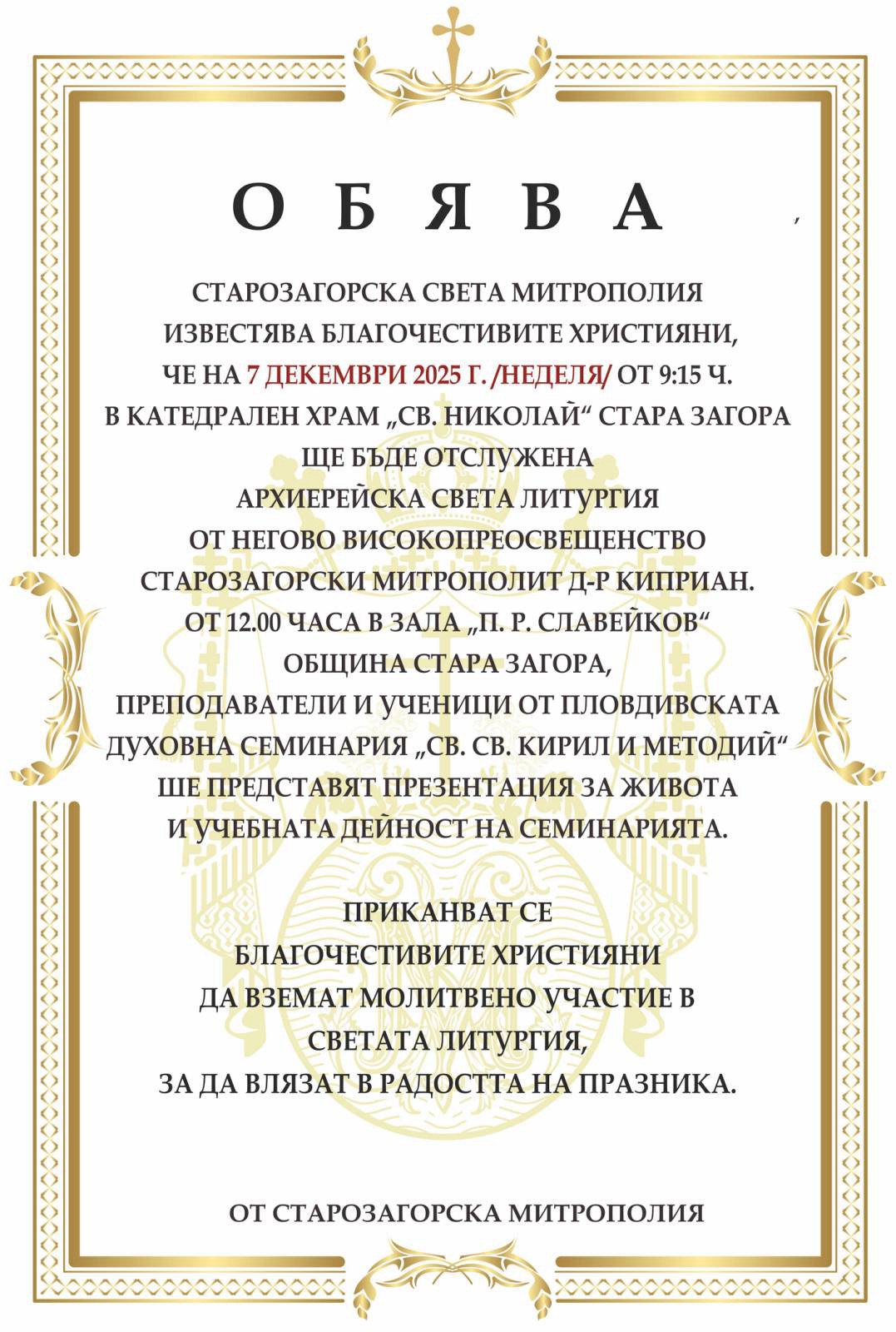Негово Високопреосвещенство Старозагорският митрополит д-р Киприан и Пловдивската духовна семинария „Св. св. Кирил и Методий“ в партньорство с Община Стара Загора подготвят изнесен „Ден на отворените врати“. Инициативата е насочена към ученици от 6. и 7. клас, както и към техните родители, които проявяват интерес към духовното възпитание и развитието на младите хора. Целта ѝ е да представи духовното образование и живота в Семинарията пред ученици, родители и образователната общност.