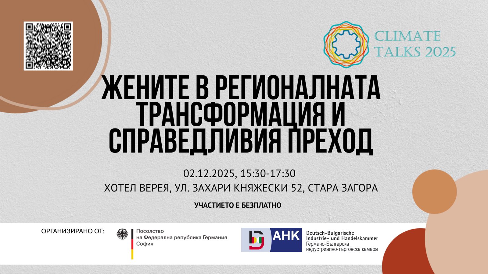 Дискусионен форум под наслов „Жените в регионалната трансформация и справедливия преход“ ще разисква едно от най-значимите предизвикателства за Стара Загора и областта ни – прехода отвъд въглищната индустрия. Форумът ще се състои на 2 декември 2025 г., вторник, от 15.30 до 17.30 часа в конферентната зала на хотел „Верея“.