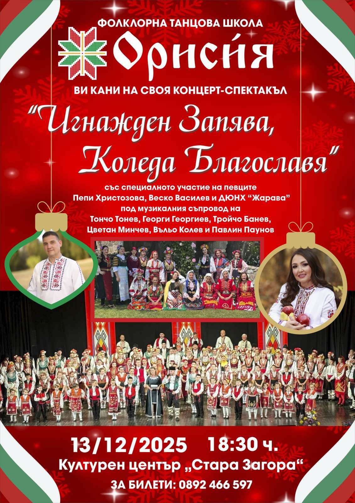 Фолклорна танцова школа „Орисия“ организира концерт-спектакъл по повод 3-годишнината от създаването на състава. Концертът е под наслов „Игнажден запява, Коледа благославя“ . Ще се проведе на 13 декември 2025 г. от 18.30 ч. в Културен център „Стара Загора“.