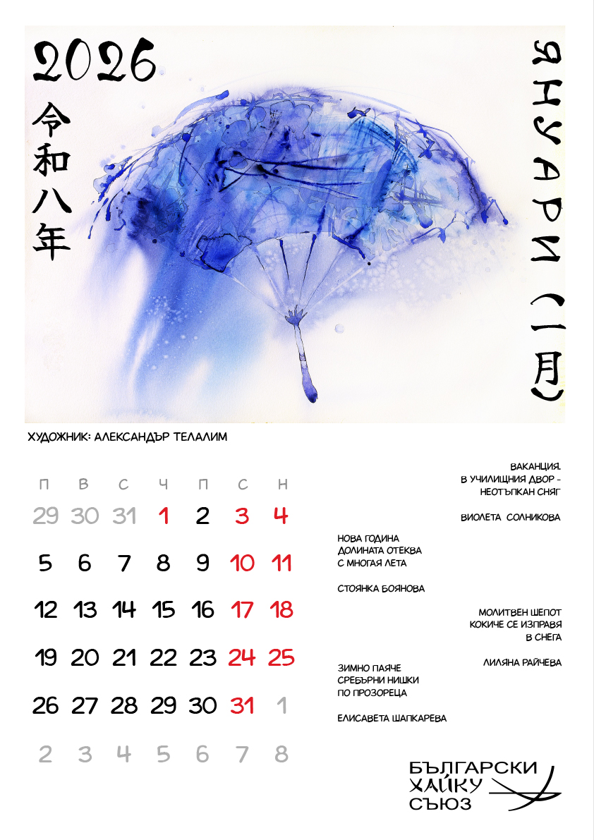 бихме искали да ви уведомим, че приемаме заявки за календара на Български хайку съюз за Новата 2026 г. Пожеланията, които отправяме към Вас, са за здрава, щастлива, успешна и изпълнена с красиви мигове и творчески начинания Нова година, както и с надежда за едно по-добре бъдеще, което се надяваме, да е мирно и спокойно за всички хора по света!