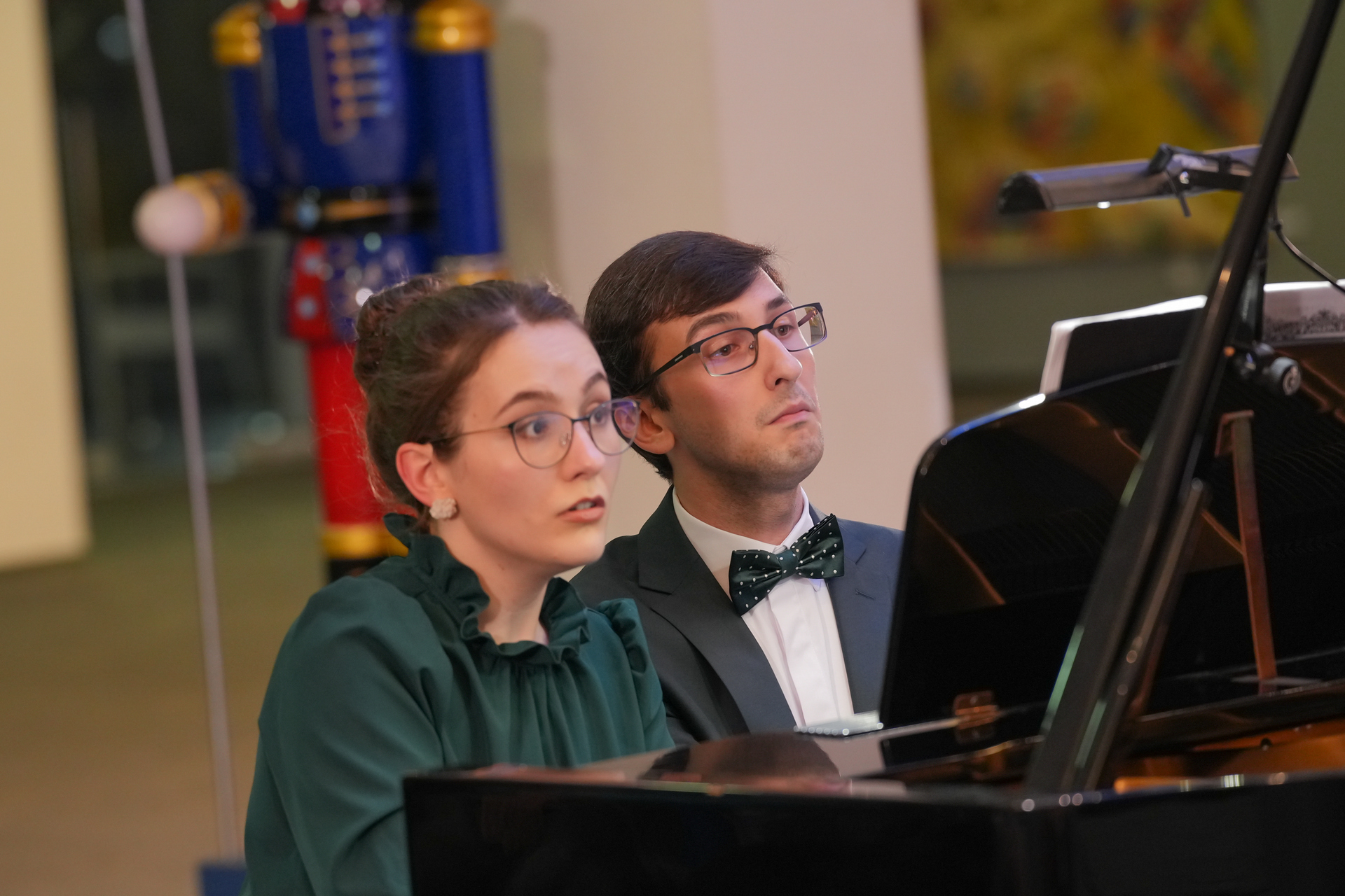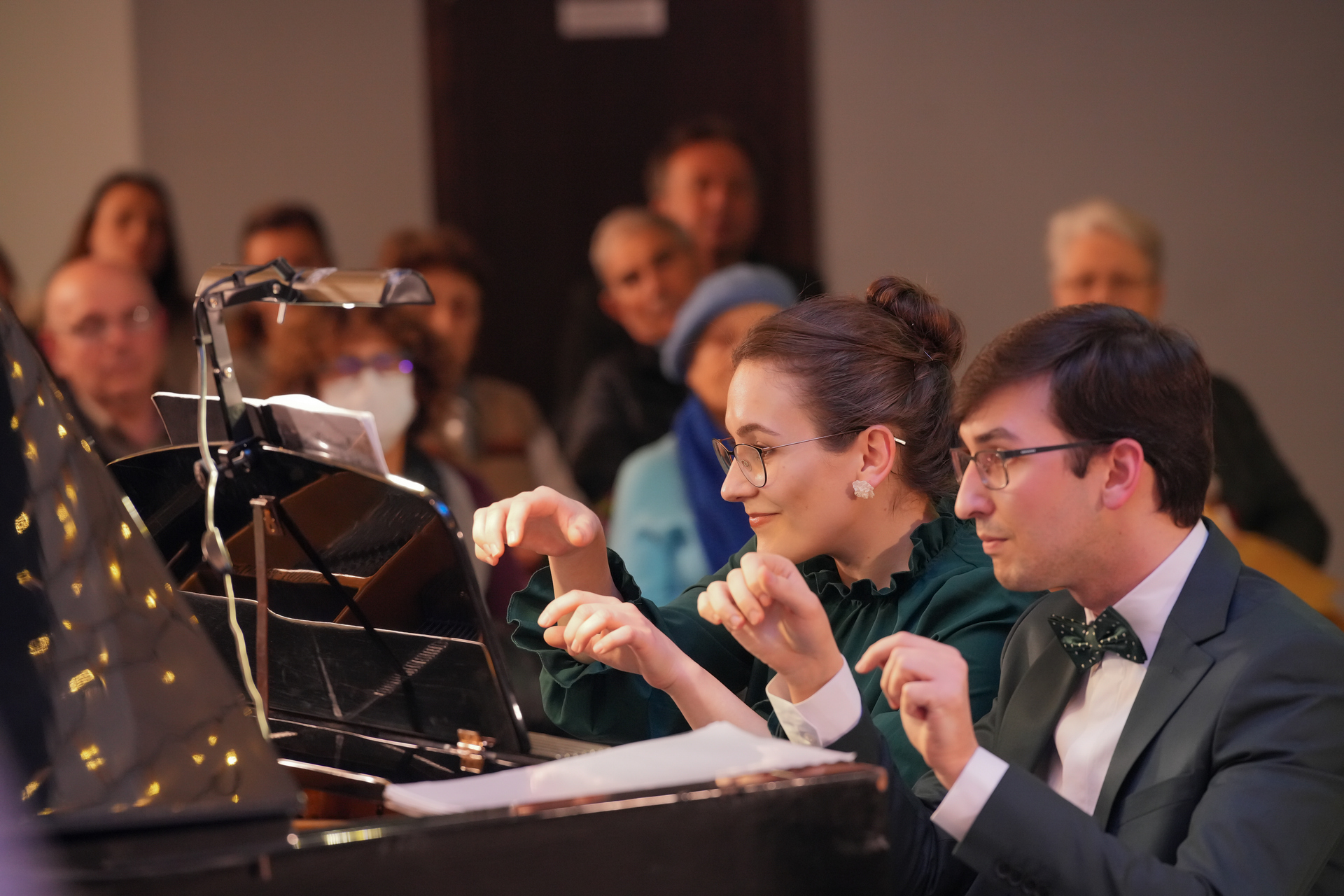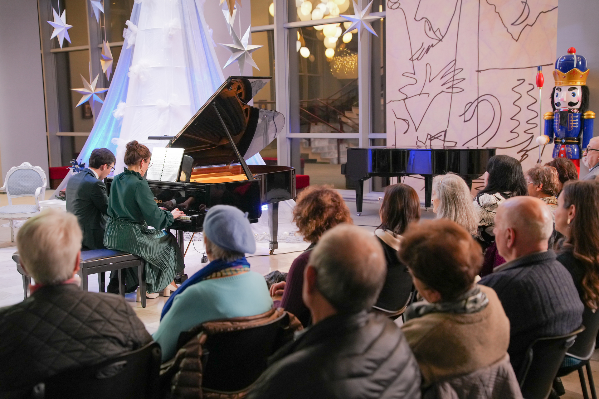 Събота вечер /13 декември 2025 г./ във фоайето на Операта омагьосано слушахме „Приказки за четири ръце“ –  концерт на Клавирно дуо Стефания Русева и Симон Павлов. Коледа е, и всеки очаква под елхата своя подарък. Един предпочита обемисти подаръци, друг – малки, но особено ценни, безценни. Такъв формат подарък за всички ни беше този концерт – малък, скъпоценен, като от красива кадифена кутийка.