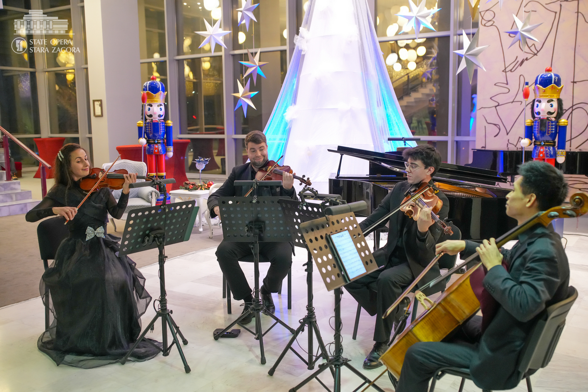 В горното фоайе, заобиколен от публиката, щрайх квартет изпълняваше познати класически произведения. От година на година (а аз за радост към от първото издание) „Наздравицата“ става удобно и желано място за срещи на приятели, на семейства, на меломани. Много от гостите резервират местата си месеци преди да се завърнат по празниците от чужбина. Някои от тях ми споделиха, че освен програмата и кетъринга, празникът е преди всичко в атмосферата, в уюта на любимата опера, в изненадите, в настроението и вълнението.