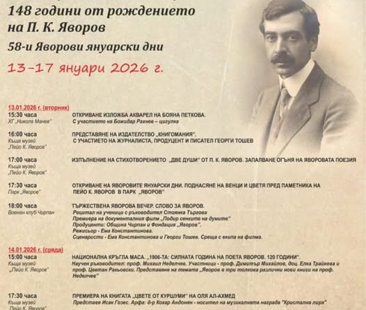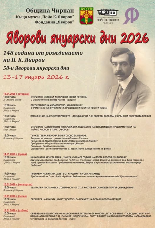 На 13 януари в Чирпан за 58-и пореден път ще започнат ежегодните Яворови януарски дни. Те водят началото си от 1968 г. Тази година програмата предлага събития, които ще продължат до 17 януари 2026г. Организатори са Община Чирпан, Къща музей „Пейо Яворов“ и фондация „Яворов“ .