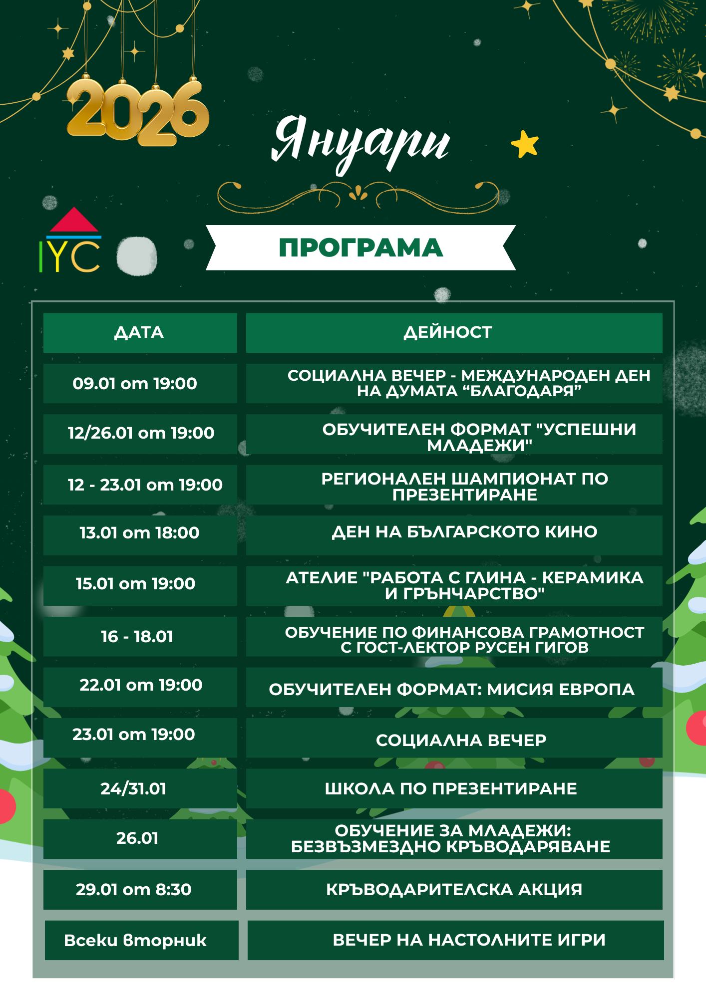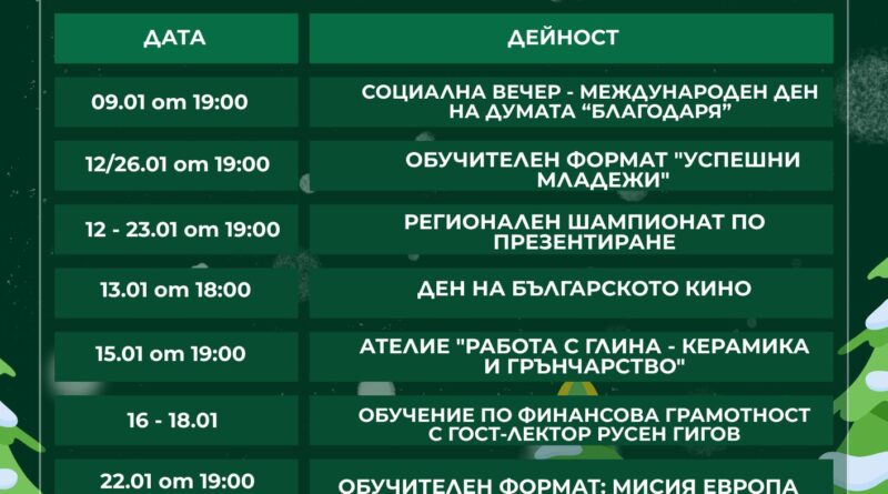Програмата започва на 9 януари от 19.00 ч. със социална вечер, посветена на Международния ден на думата „благодаря“. В средата на месеца са предвидени обучителни формати за успешни младежи, регионален шампионат по презентиране, както и отбелязване на Деня на българското кино.