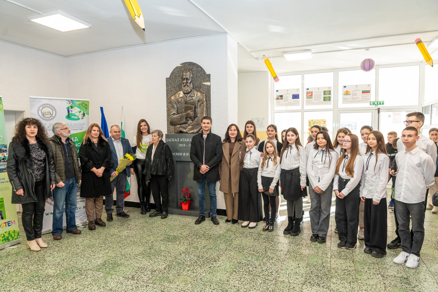 Мястото на скулптурното изображение е точно тук, в СУ „Иван Вазов“, посочи зам.-кметът Надежда Чакърова, която заедно със зам.-кмета Милена Желева и секретаря Николай Диков почете събитието