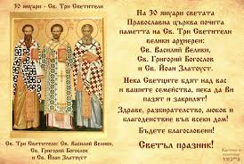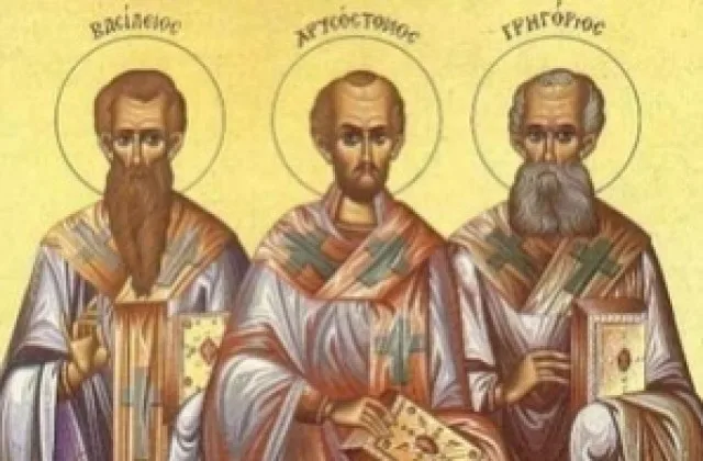 Богоречиви църковни учители, достигнали святост, епископи, просияли в невечерния ден на Божието Царство, честваме днес. Тачим с еднакво преклонение и просим молитвената помощ на великия Василий, на свети Григорий, наречен Богослов, и на Златоустия проповедник – славния Йоан. И тримата просияват през четвъртото столетие – „златният век“ на християнското богословие.