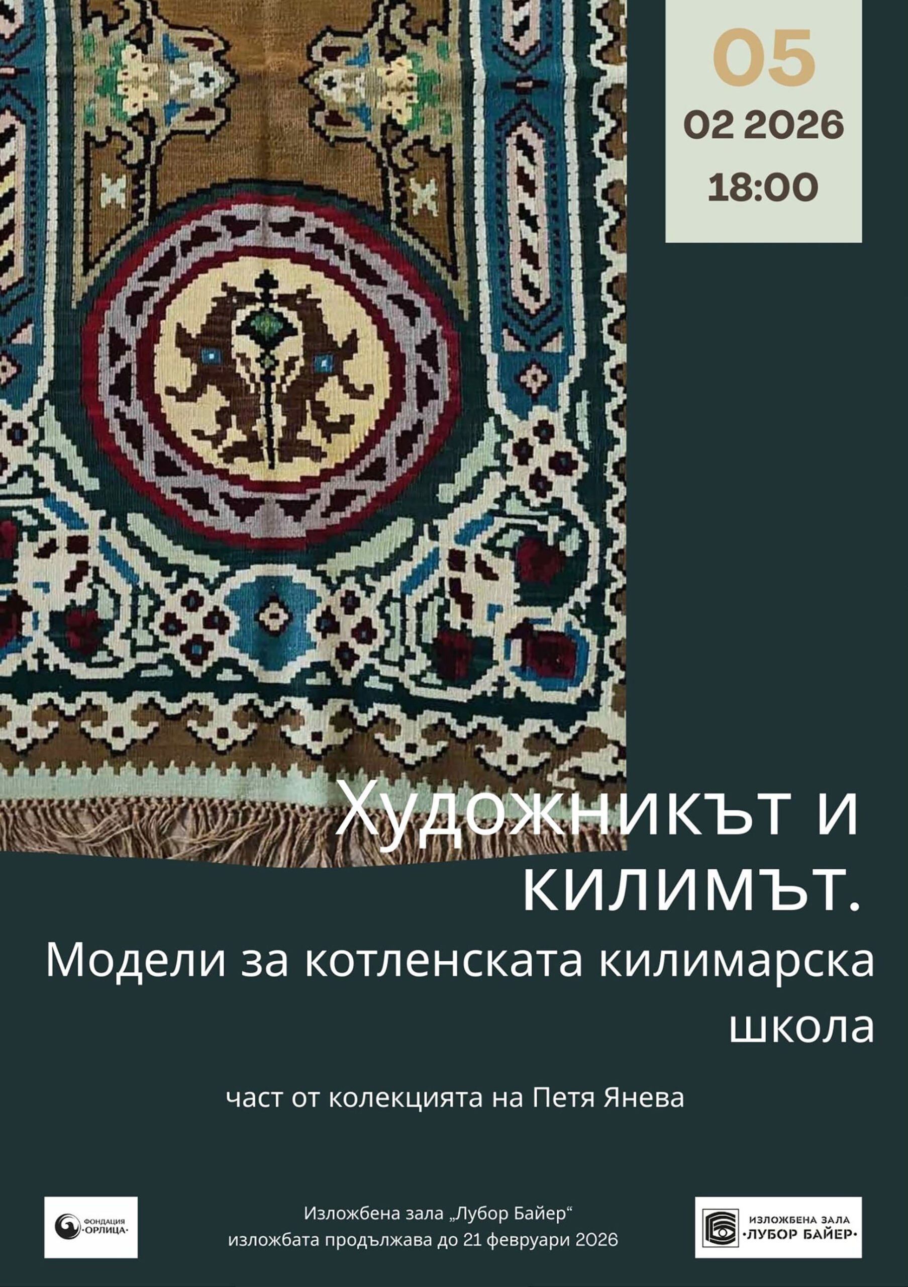 В Изложбена зала „Лубор Байер“ в Стара Загора се представя изложбата „Художникът и килимът. Модели за котленската килимарска школа“, съорганизирана от Фондация „Орлица“. Експозицията проследява развитието на котленския килим като едно от най-значимите явления в българското приложно изкуство и разкрива диалога между народната традиция и професионалното художествено мислене.