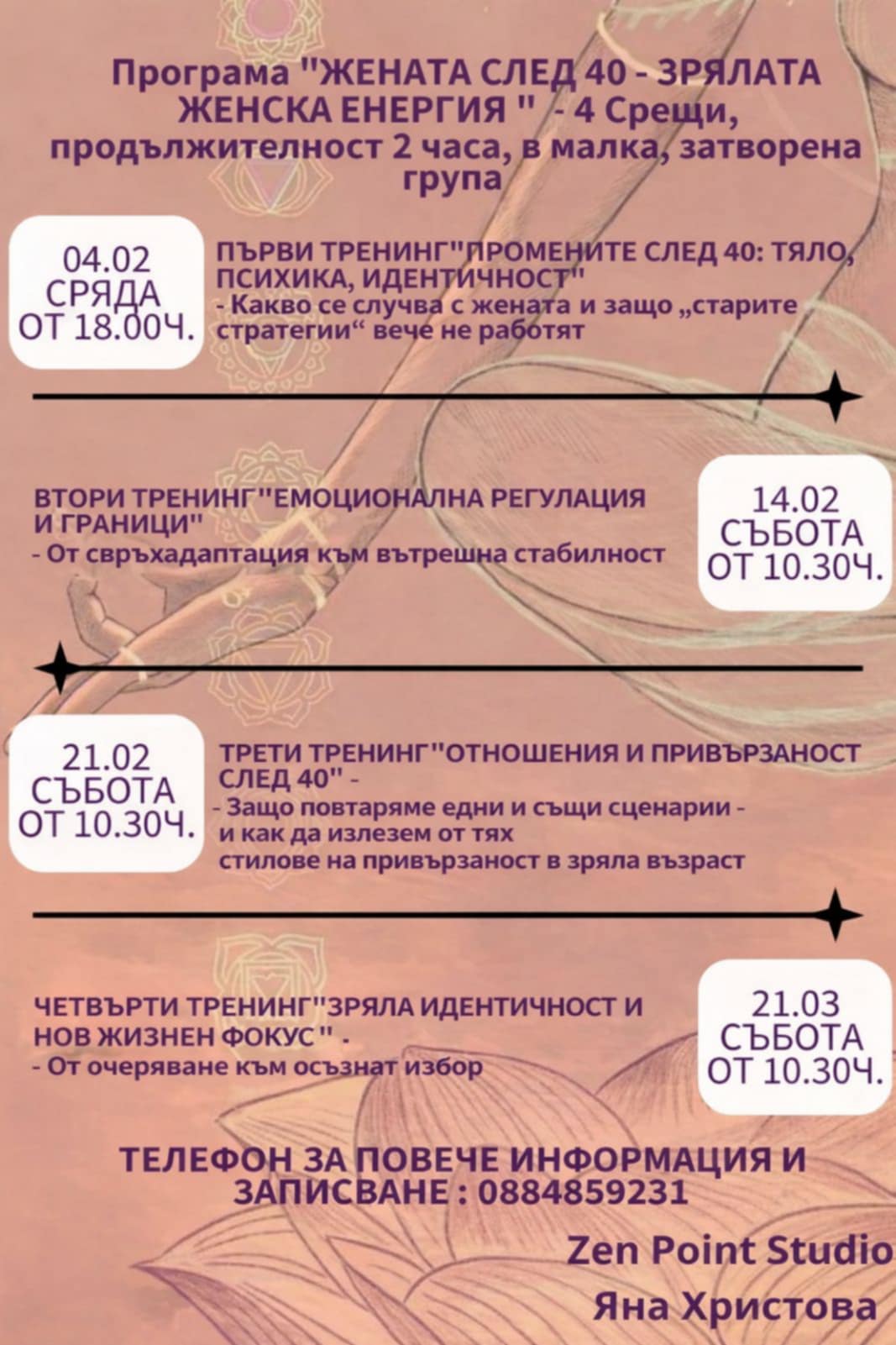 Програмата, която създадох“ Жената след 40-Зрялата женска енергия“ е предизвикателство към смелостта на жената в този нов период в живота й и затова и тази програма не е за всички.