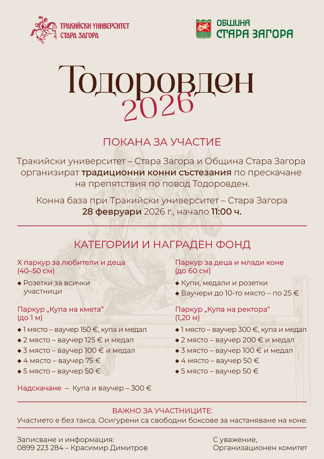Тракийски университет – Стара Загора и Община Стара Загора организират традиционните за града конни състезания по прескачане на препятствия по повод Тодоровден, които ще се проведат на 28 февруари 2026 г. в Конната база при Тракийски университет – Стара Загора. Началото на събитието е в 11:00 часа.