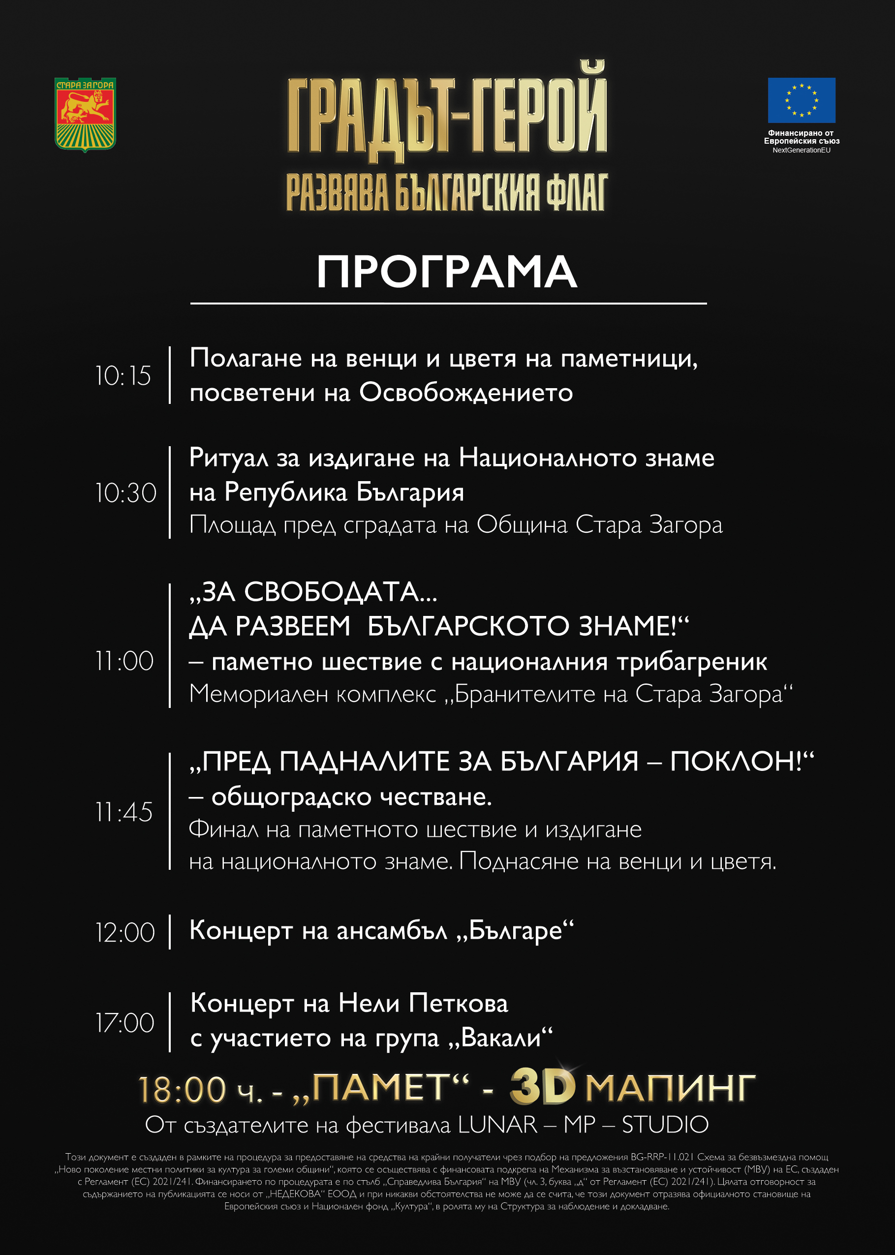 Свободата на България има своята дата – 3 март. Ден на памет, обединение, и преклонение пред българския трибагреник. И тази година Община Стара Загора превръща този ден в честване на достойнството и силата на българския дух и всенародното признание.
