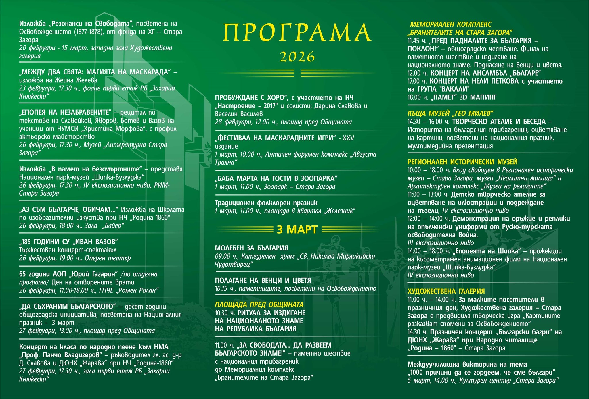 Програма на Община Стара Загора за честване на 3 март- Национален празник на Република България -2026г.