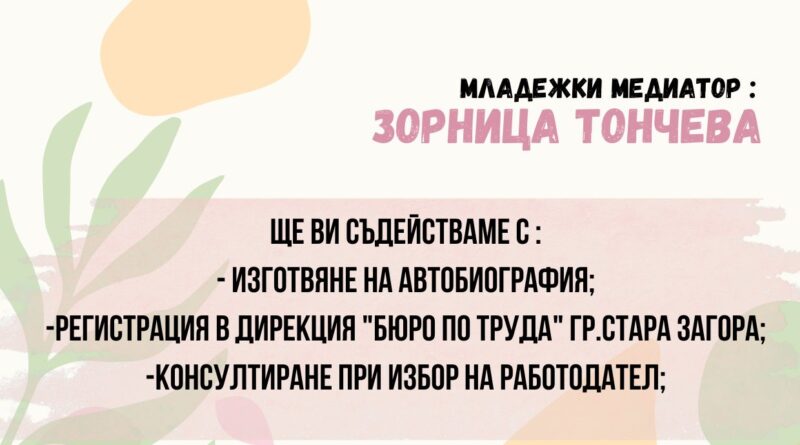 Консултациите се водят от младежкия медиатор Зорница Тончева и са насочени към ориентиране на младите хора в процеса на търсене на заетост, както и към повишаване на тяхната увереност и подготовка за пазара на труда.