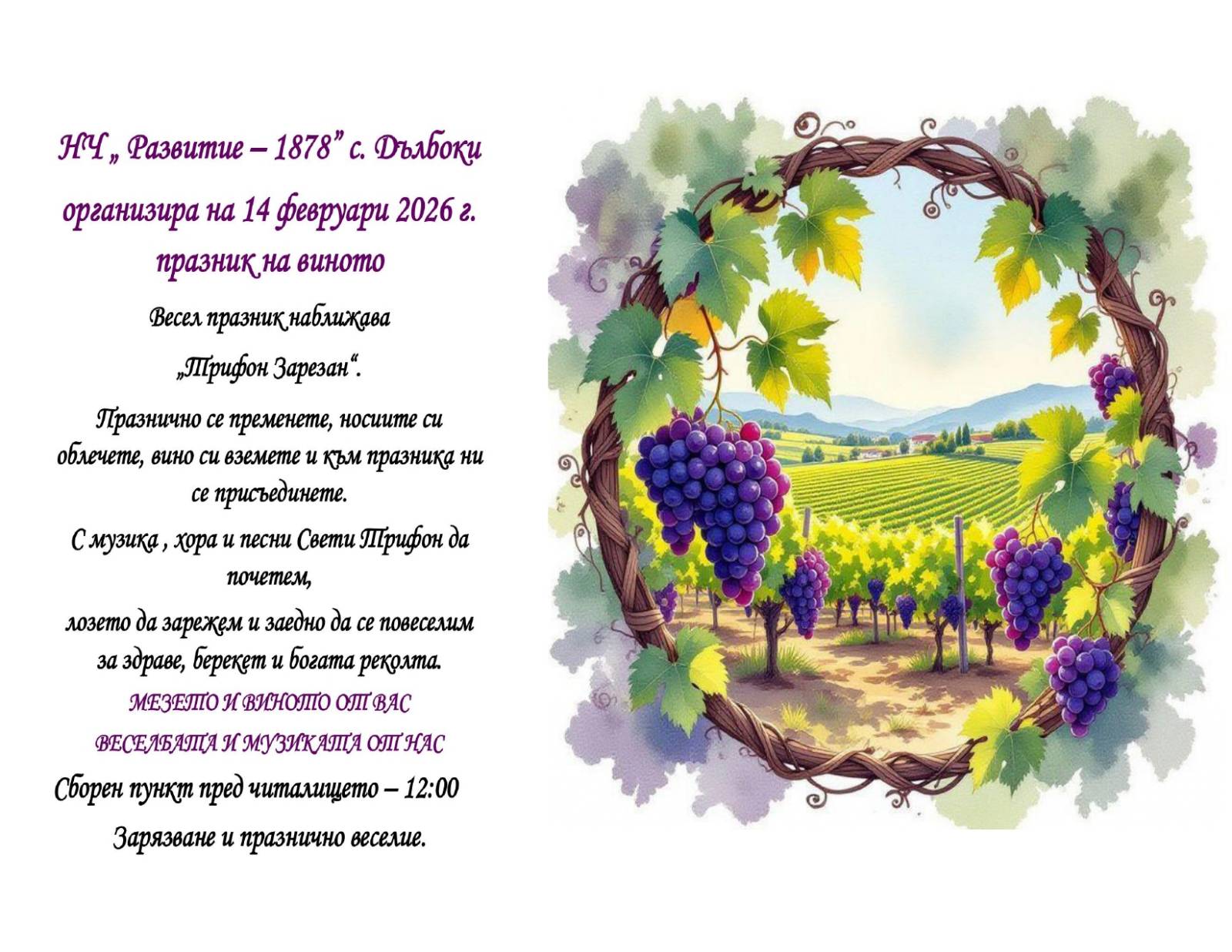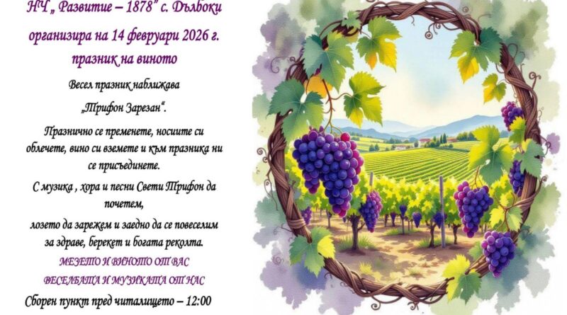 Старозагорското село Дълбоки ще отпразнува Трифон Зарезан на 14 февруари 2026 г. (събота). Празникът ще започне от 12.00 ч. на площада на селото, а оттам присъстващите ще се отправят към лозята за да почетат традицията със зарязването.
