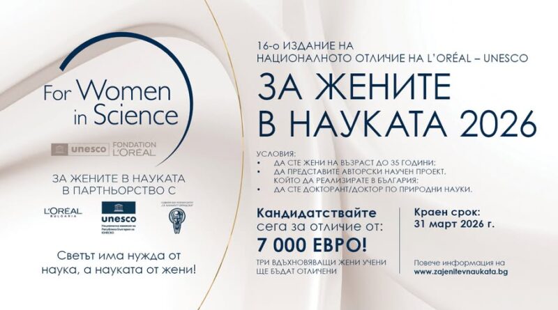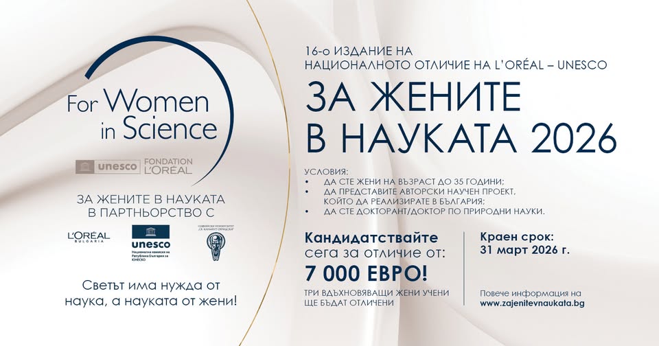 Започна кандидатстването за шестнадесетото издание на Националната програма „За жените в науката“, насочена към млади жени учени в областта на природните науки от цяла България. През 2026 г. за първи път размерът на финансовото отличие се увеличава – от 5000 на 7000 евро, като в рамките на шестнадесетото издание ще бъдат присъдени още три отличия. Крайният срок за кандидатстване е 31 март 2026 г.
