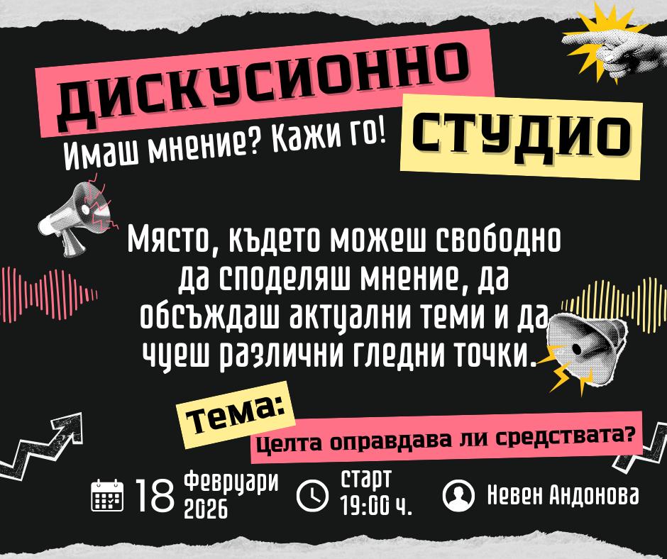 Международният младежки център – Стара Загора възобновява дискусионния си формат с нова тема, която засяга личните и обществените избори – „Целта оправдава ли средствата?“. Срещата ще се проведе на 18 февруари 2026 г. от 19.00 ч. и е насочена към млади хора, които имат желание да участват в смислен и аргументиран разговор.