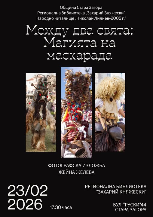 23 февруари от 17.30 часа в Регионална библиотека „Захарий Княжески“ ще бъде открита фотографска изложба „Между два свята: Магията на маскарада“ на Жейна Желева. Безспорно, тя е сред най-добрите и доказали се фотографи в региона и страната. Изложбата може да се нарече ретроспективна, защото представя кадри от първото издание на Фестивала до най-новите от 2025г.