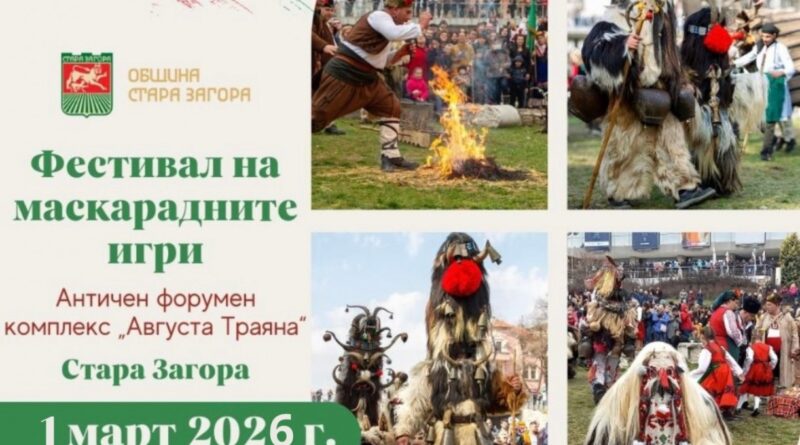 Навръх 1-ви март 2026г. над 800 колоритни маскирани персонажи ще гонят злите сили в Стара Загора. От всички краища на България чауши, бабугери, станчинари, дервиши, старци, сурати, баба̀ри, бабри, сурова̀ри, калогерос, джумали, кьопек бей или джамалари и маскари, ще участват в 25-ото издание на Фестивала на маскарадните игри. Празникът ще стане още по-пъстър и радостен защото съвпада с посрещането на Баба Марта и с Деня на художествената самодейност.