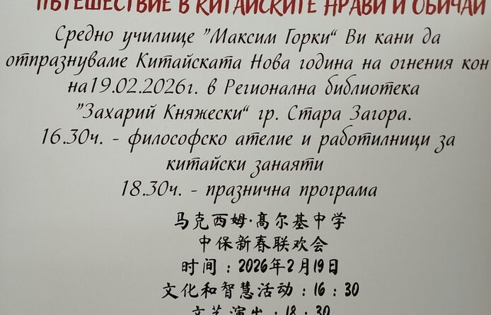 Единственото училище в област Стара Загора с изучаване на китайски език – Средно училище „Максим Горки“, организира празничен концерт по случай китайската Нова година. Това съобщават на официалната Фейсбук страница на учебното заведение. Концертът ще се проведе днес, 19 февруари, на сцената на Регионална библиотека „Захарий Княжески“.