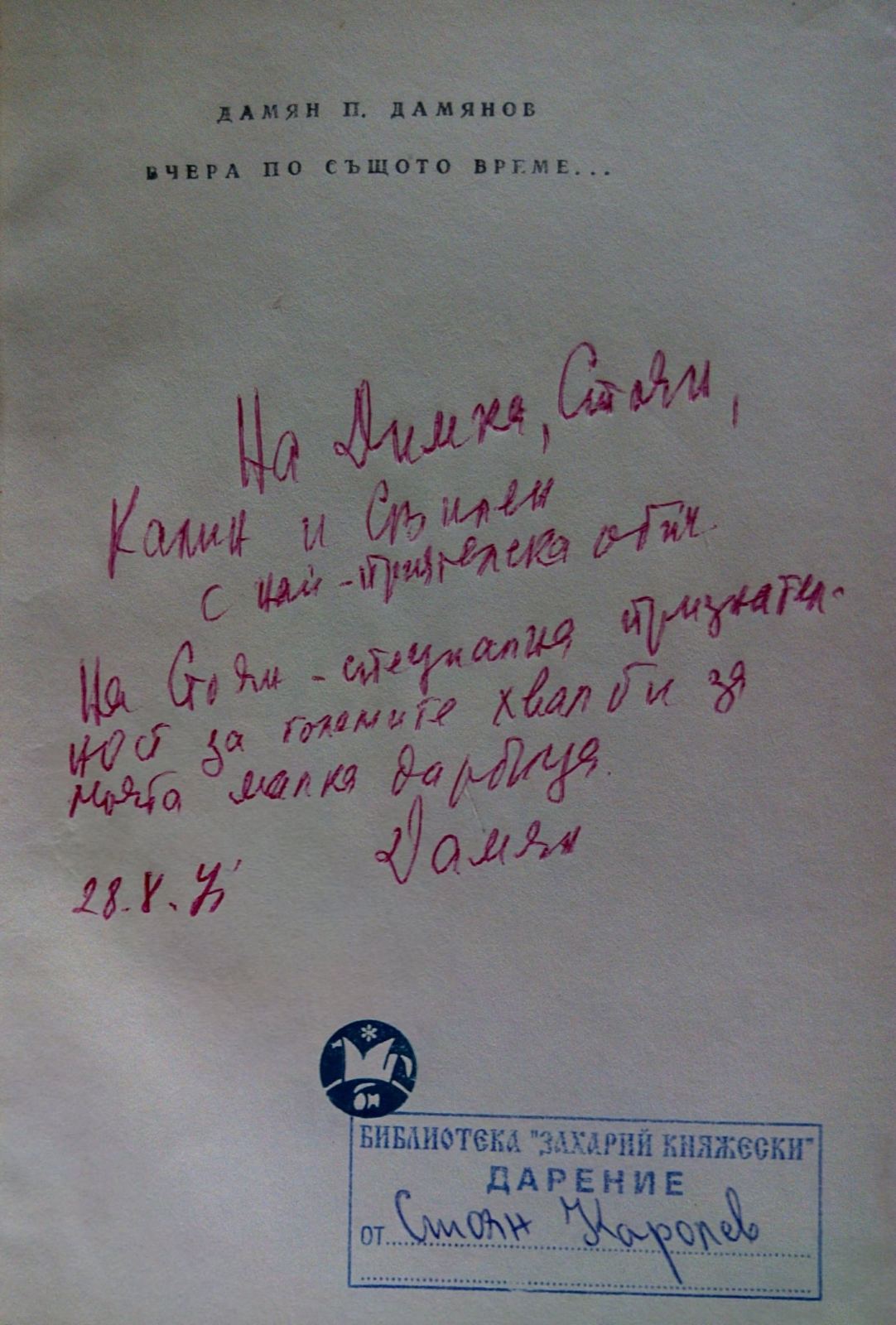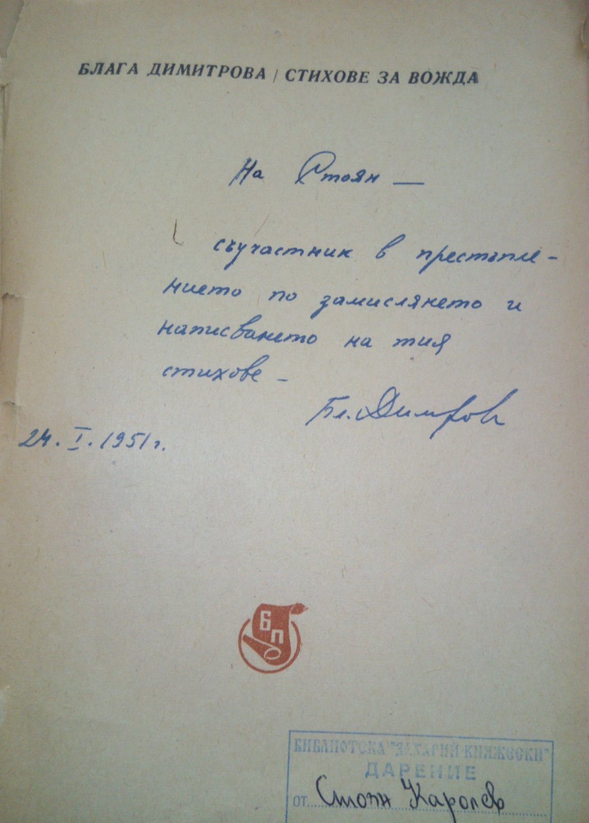 Стара Загора. Във фонда на библиотеката постъпват 2012 книги и 215 периодични издания за времето от 1919 до 2005 г. По волята на дарителя са обособени в самостоятелна колекция. Пълно проучване на тази колекция прави през 2017 г. Ивелина Вътева – библиотекар в Регионалната библиотека. Това е тема на дипломната ѝ работа. Изследването е публикувано в сборника доклади от ХХVII Национална конференция на ББИА от юни 2017 г. Изследователката характеризира сбирката като 888 книги с посвещения от 351 автори в периода 1947 – 2005 г.; предимно на български език, но и на руски, немски, италиански и румънски; превес има художествената литература. Дарението включва и няколко пощенски картички. Колекцията може да бъде ползвана на място в библиотеката.