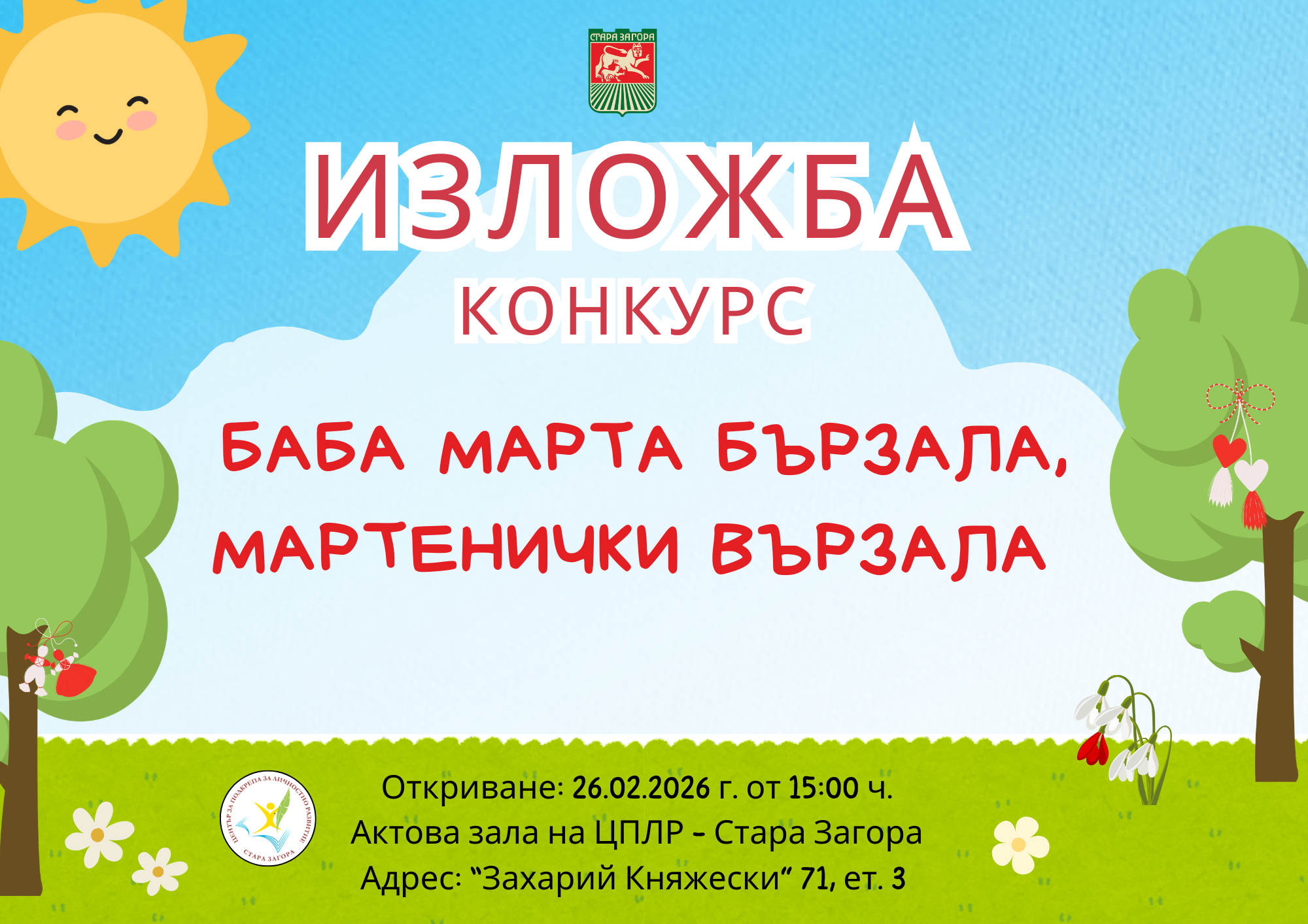 На 26.02.2026 г. от 15.00 ч. в залата на ЦПЛР – Стара Загора на ул. Захарий Княжески № 71 ще бъде открита изложбата и ще бъдат наградени участниците в конкурса. Специални гости на откриването ще бъдат децата от ДГ №17 „Знаме на мира“ и ДГ №33 „Люляк“.