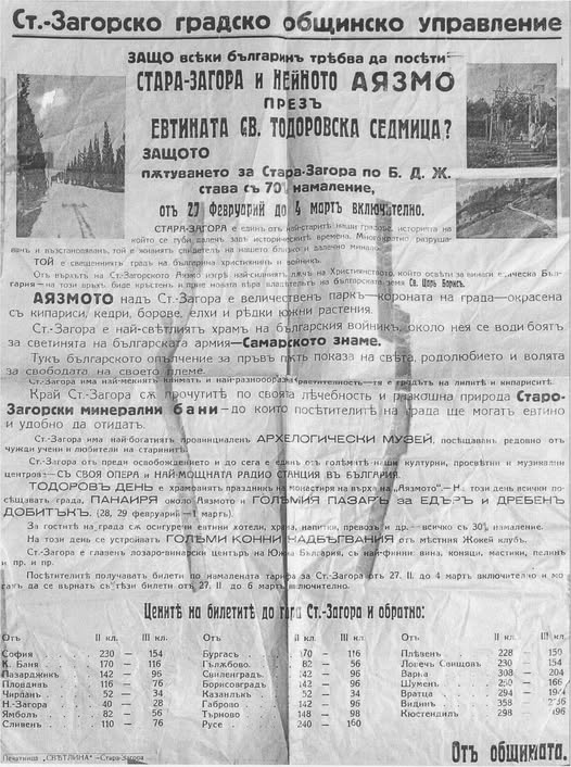 „Защо всеки българин трябва да посети Стара Загора и нейното Аязмо през евтината Св. Тодоровска седмица?“ е въпрос, който решихме да зададем отново — едно столетие по-късно.